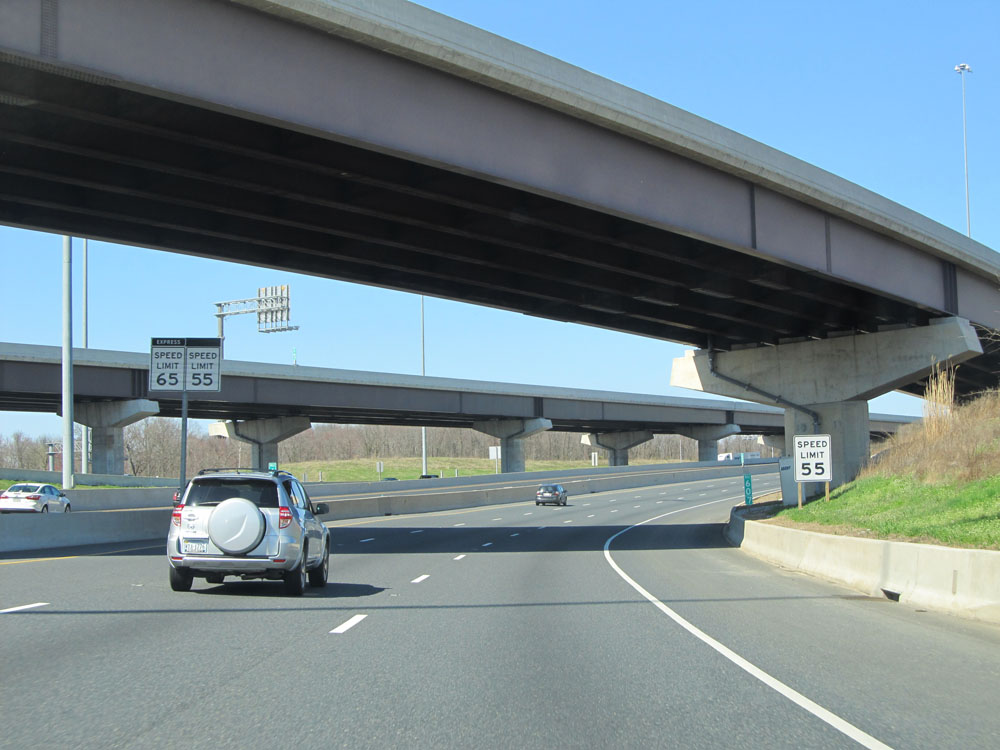 Speed limit signs at mile marker 60.7. The speed limit in the express lanes is 65 mph, while the normal lanes are restricted to 55 mph. (Photo taken 4/11/15).