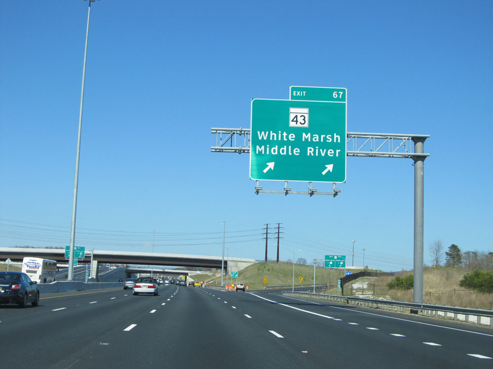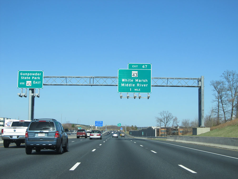 Interstate 95 North at Exit 67: MD 43 - White Marsh / Middle River (Photo taken 4/11/15).