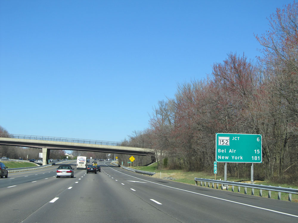 Mileage sign at mile marker 68.4. It's 6 miles to the next exit (the junction of MD 152), 15 miles to Bel Air, and 181 miles to New York City. (Photo taken 4/11/15).