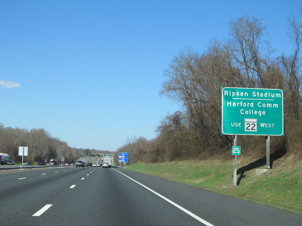 Use Exit 85 to Ripken Stadium and Harford Community College via MD 22 West. (Photo taken 4/11/15).