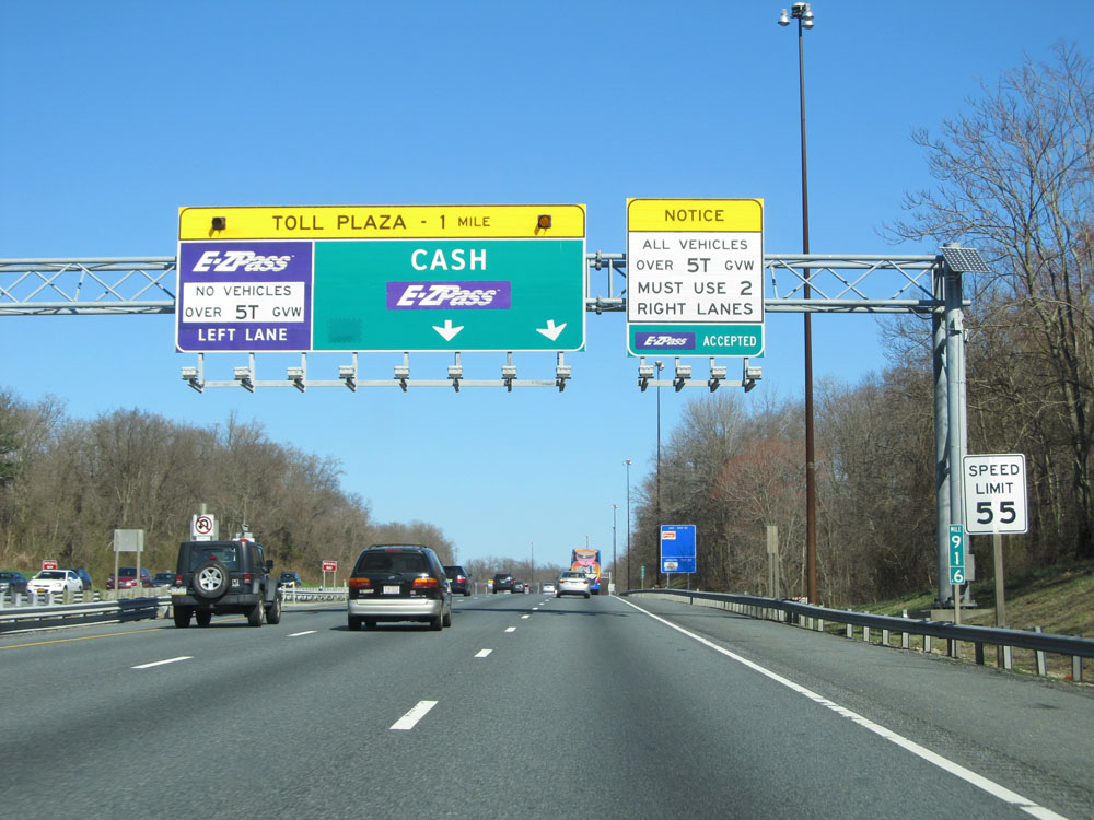 At mile marker 91.6, the speed limit decreases to 55 mph as you approach the second and final toll plaza on Interstate 95 in Maryland - 1 mile ahead. Again, cash customers should stay to the right. (Photo taken 4/11/15).
