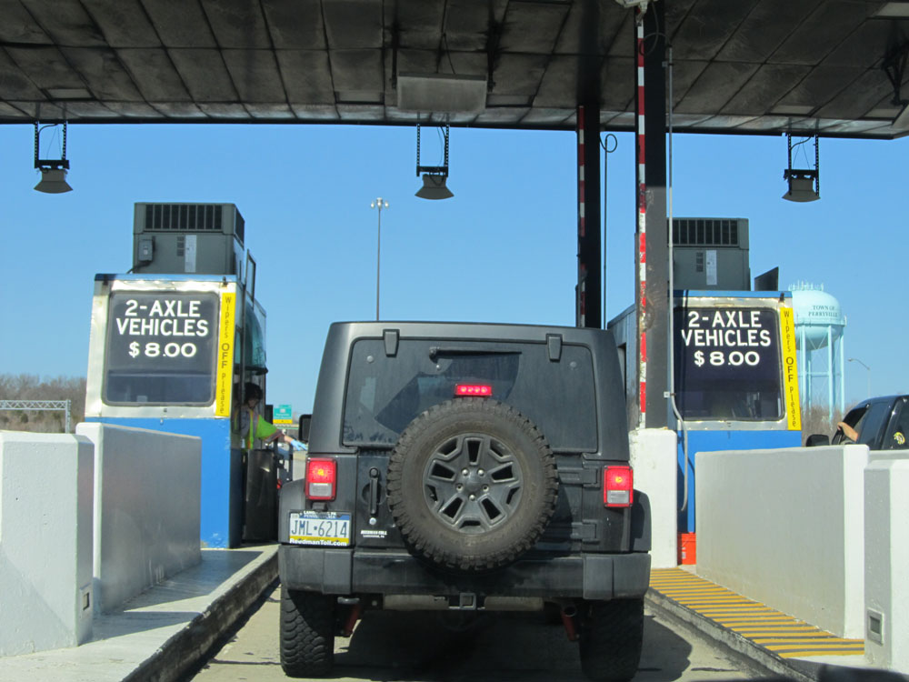 Close-up view of the toll plaza. 2-axle vehicles who are paying cash will owe $8.00 as of when this picture was taken. (Photo taken 4/11/15).