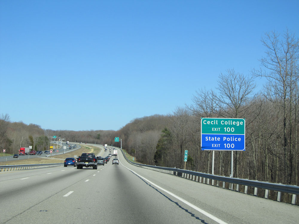 Take Exit 100 to Cecil College and the State Police barracks. (Photo taken 4/11/15).