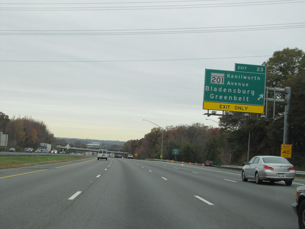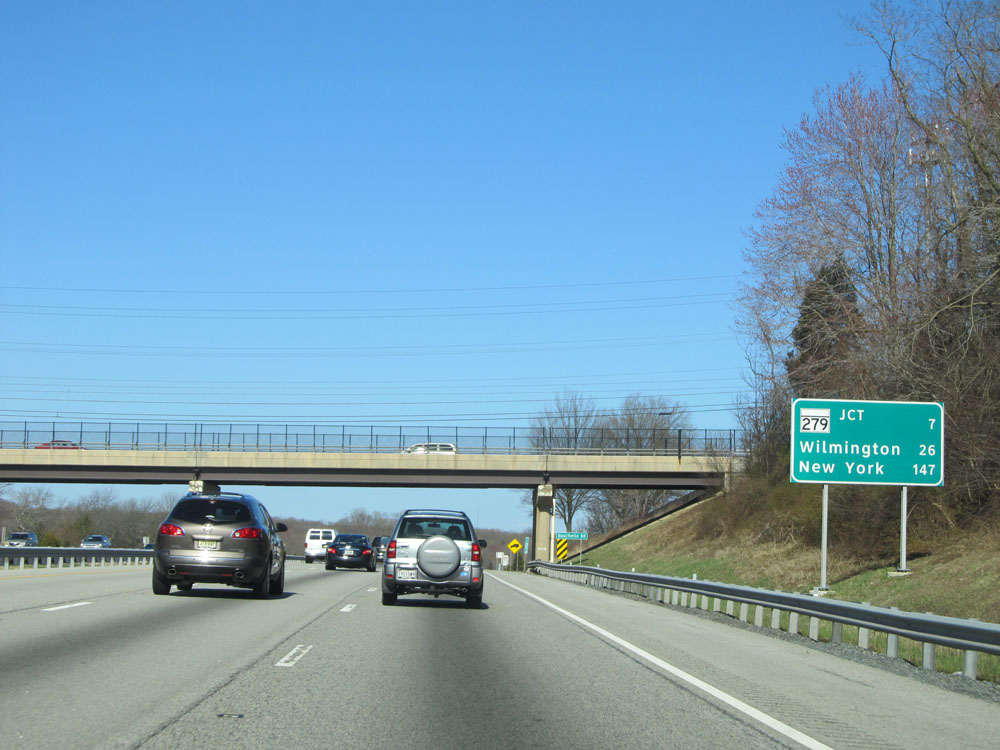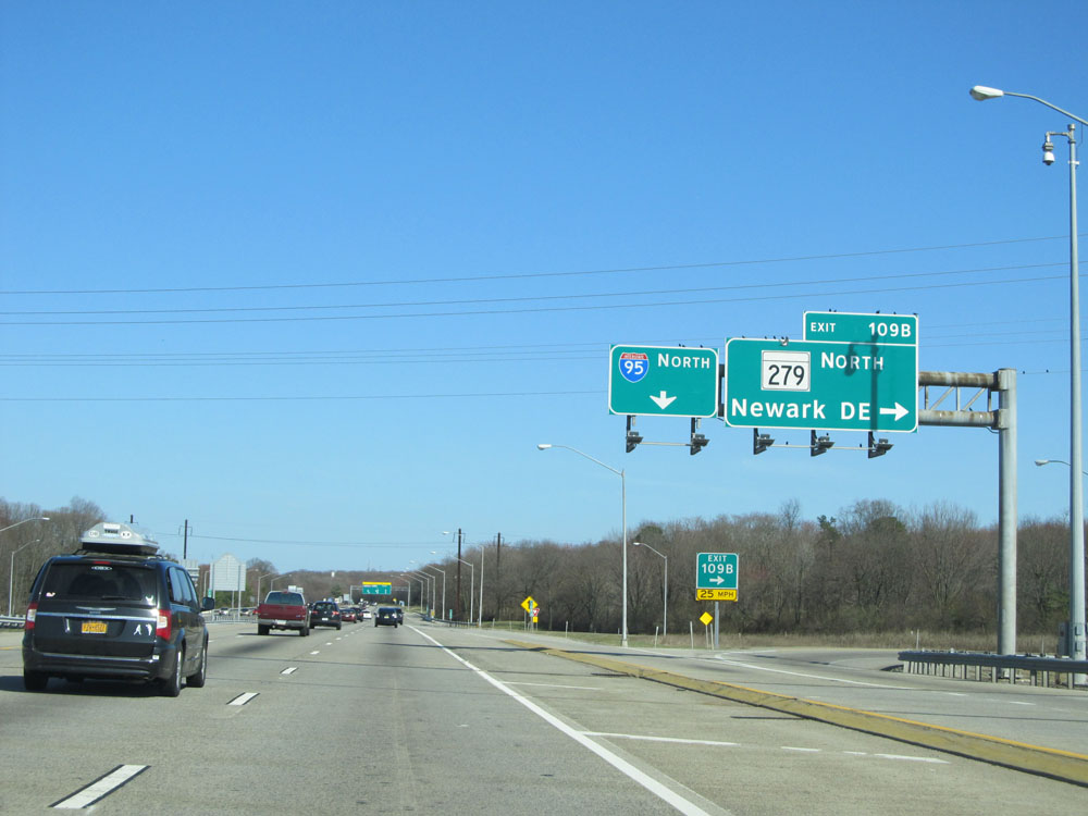 Interstate 95 North at Exit 109B: MD 279 North - Newark, DE. Just ahead lies the Delaware border. (Photo taken 4/11/15).