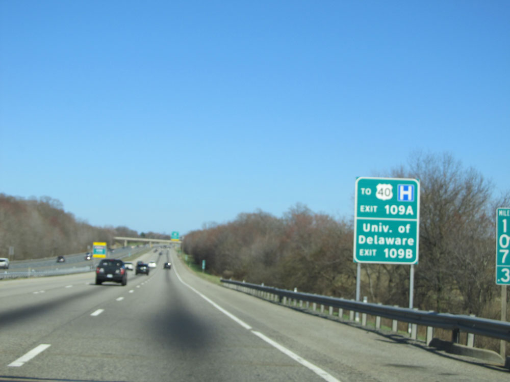 Take Exit 109A to US 40 and Exit 109B to the University of Delaware. (Photo taken 4/11/15).