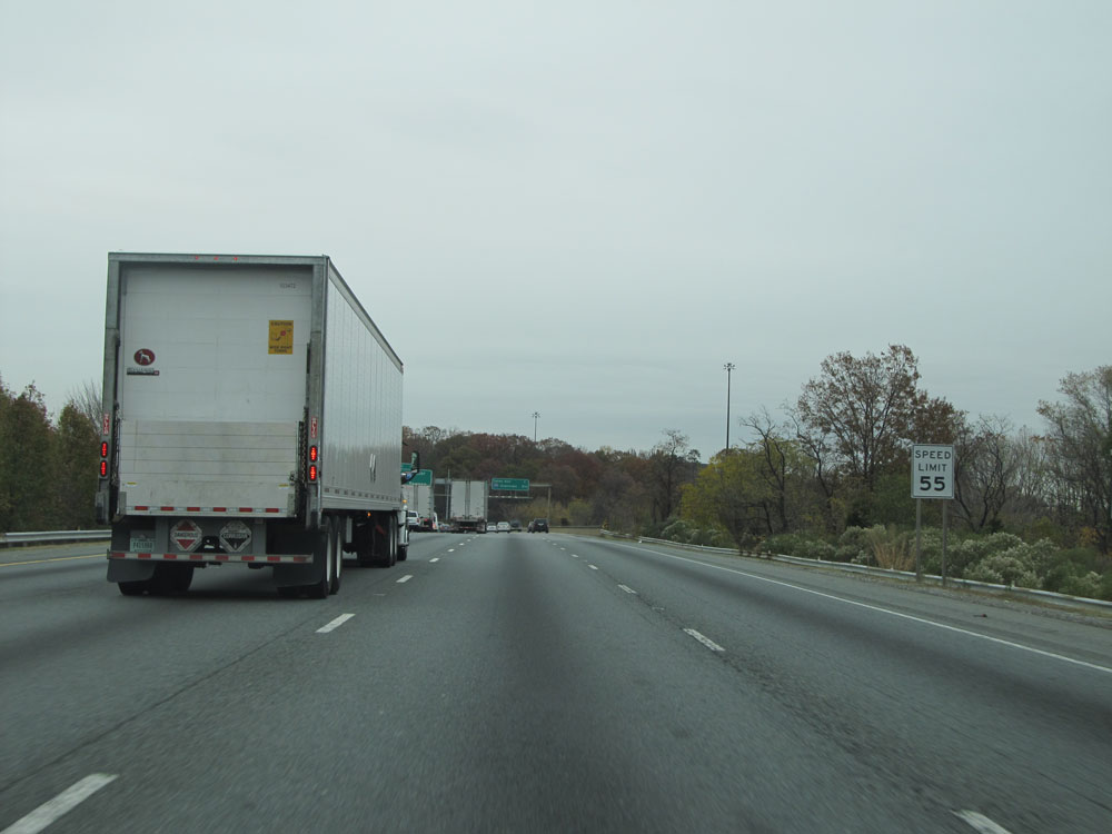 Speed limit sign on Interstate 95 North in Baltimore. The speed limit on this urban stretch of I-95 is 55 mph. (Photo taken 4/11/15).