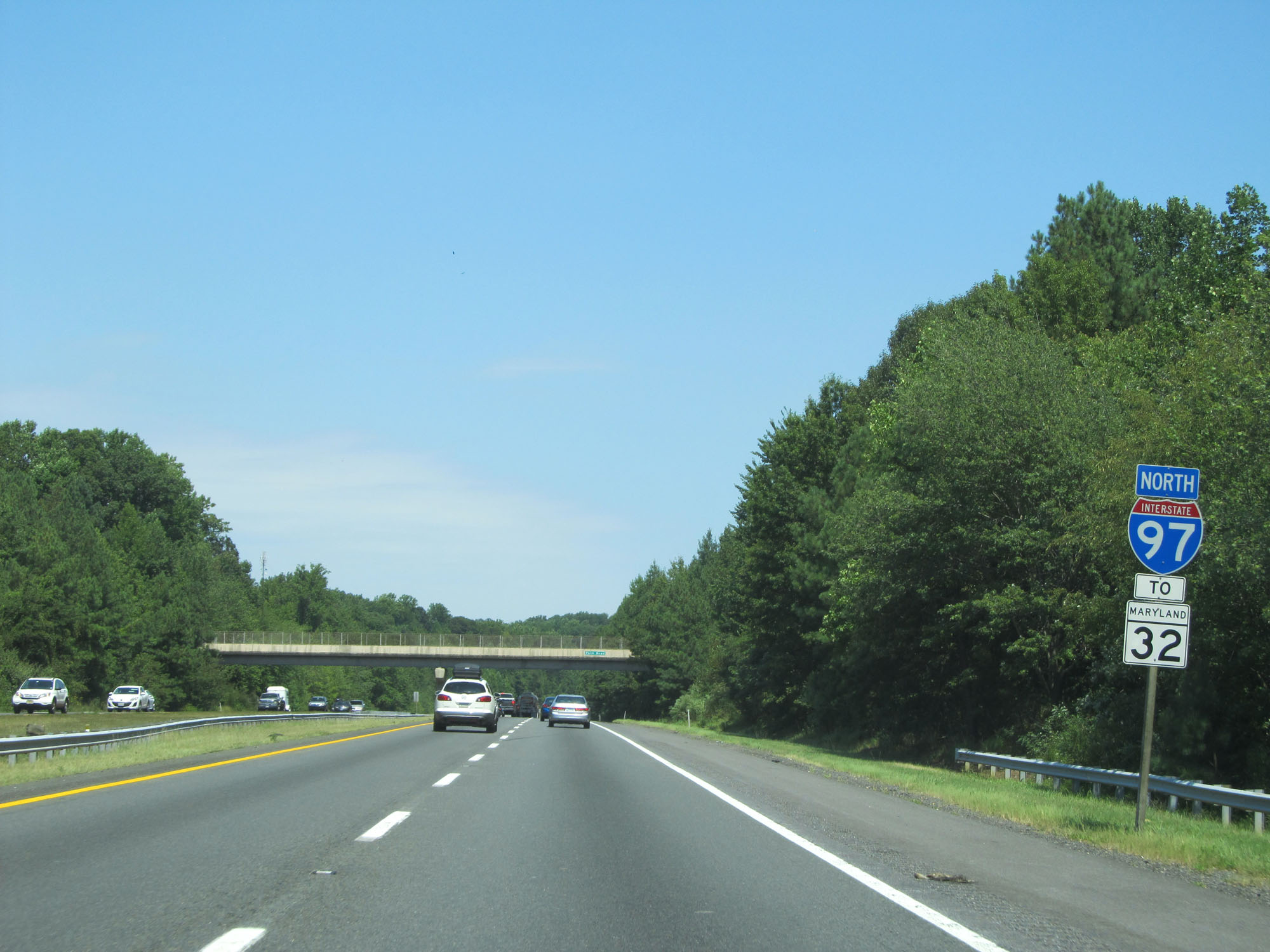 Interstate 97 North at Exit 7: MD 32 / To MD 3 South - Columbia / Bowie (Photo taken 8/9/15). |
