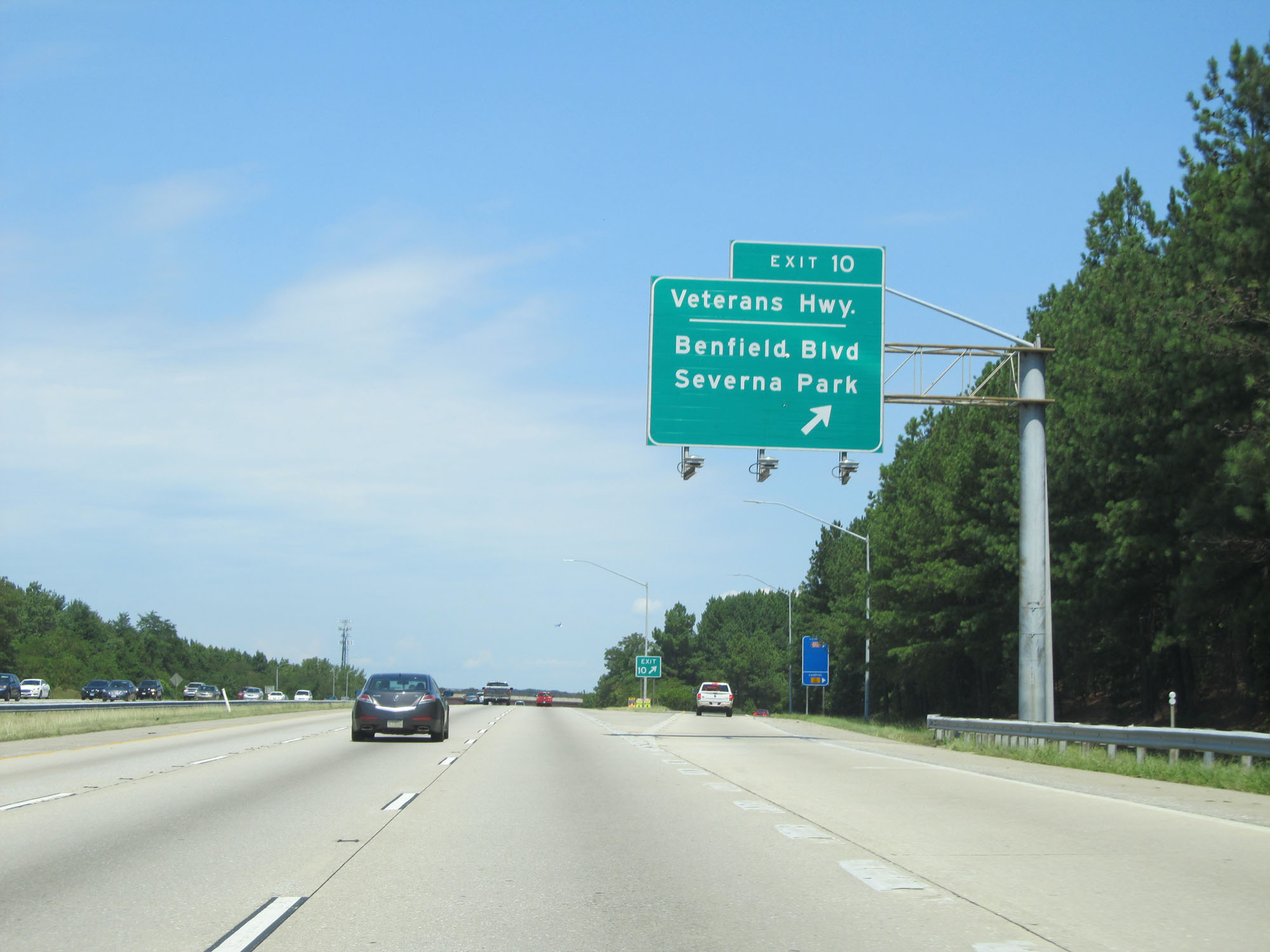 Interstate 97 North at Exit 10: Veterans Hwy / Benfield Blvd / Saverna Park (Photo taken 8/9/15). |