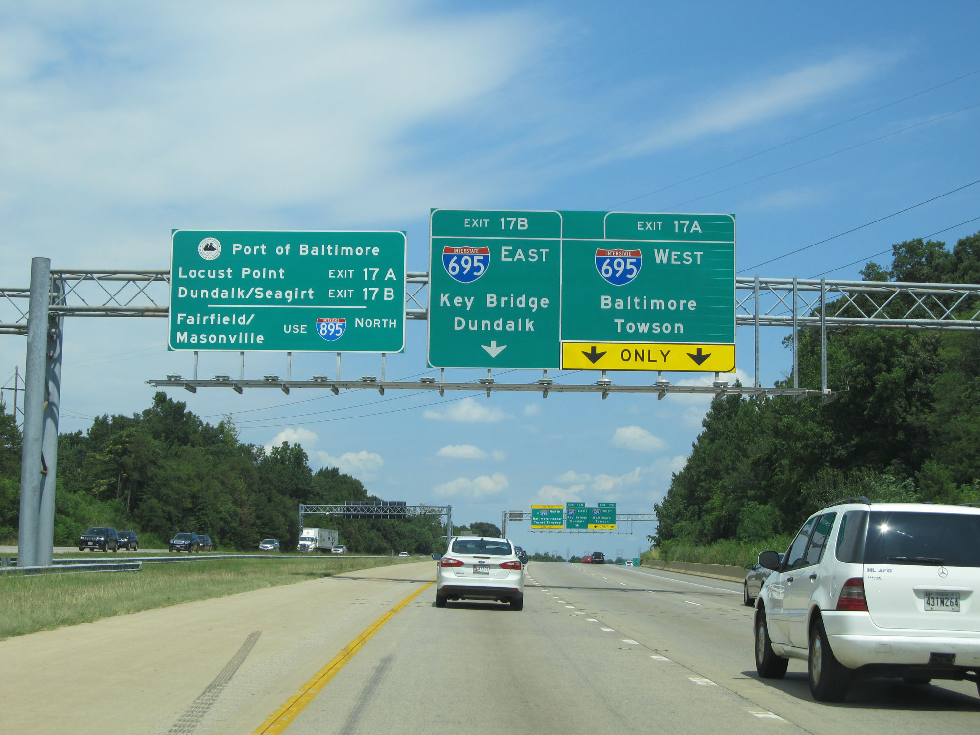 Take Exit 17A to Locust Point and take Exit 17B to Dundalk/Seagirt. Stay straight ahead (keep to the left, though) to go onto Interstate 895 North to Fairfield and Masonville. (Photo taken 8/9/15). |