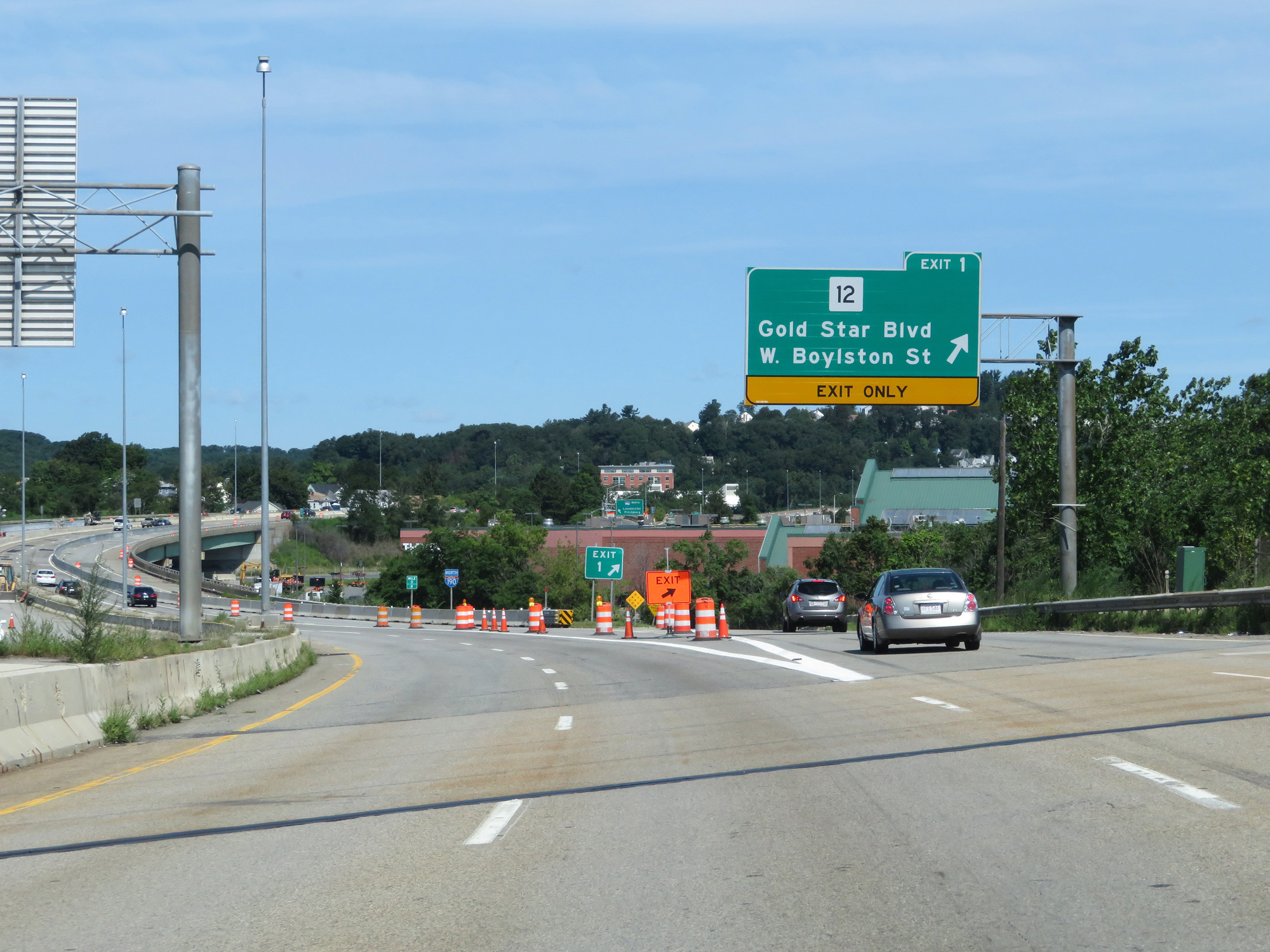 Interstate 190 North at Exit 1: MA 12 - Gold Star Blvd / West Boylston St (Photo taken 8/6/17). |