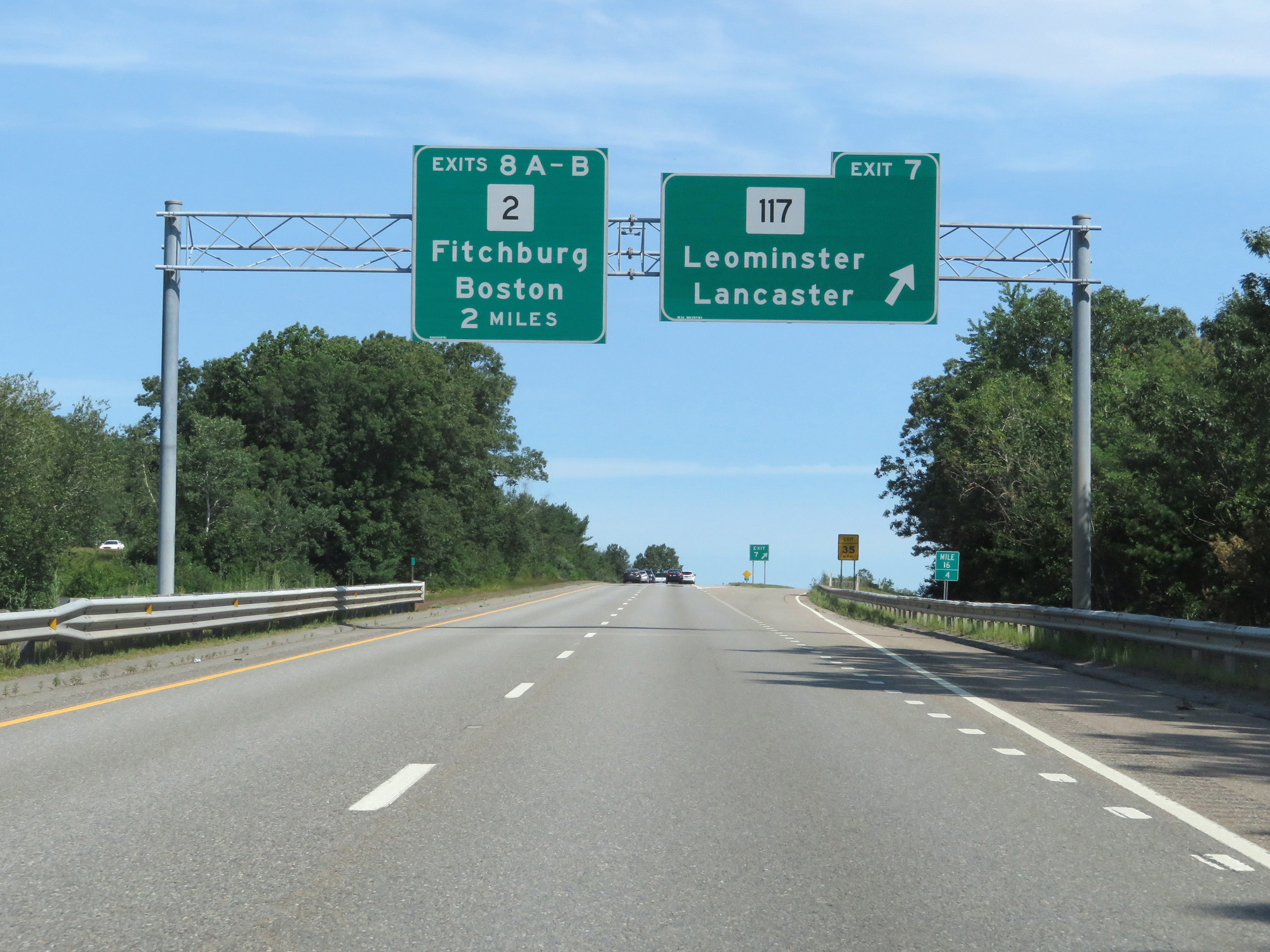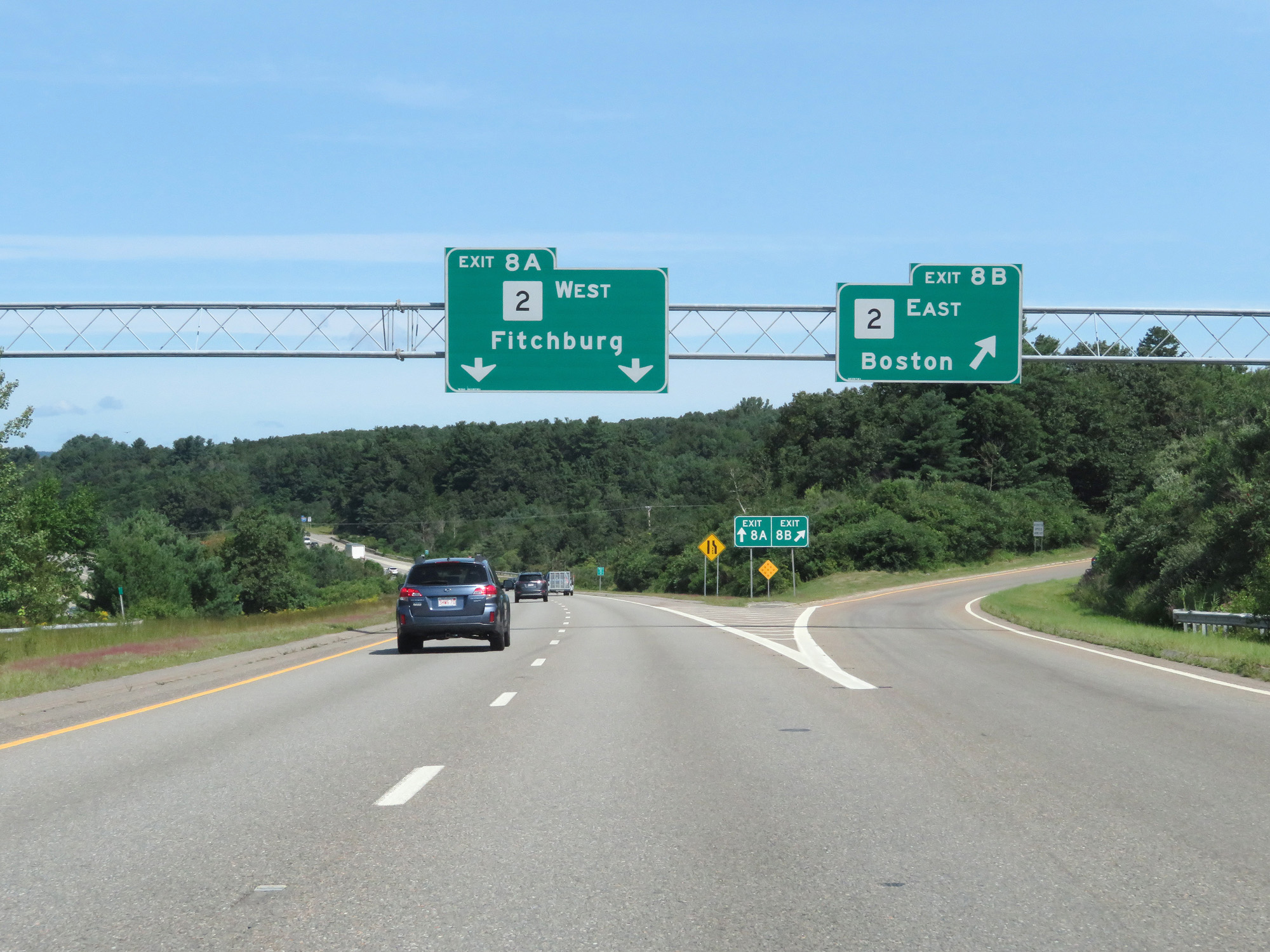 Interstate 190 North at Exit 8A: MA 2 West - Fitchburg; Exit 8B: MA 2 East - Boston (Photo taken 8/6/17). |