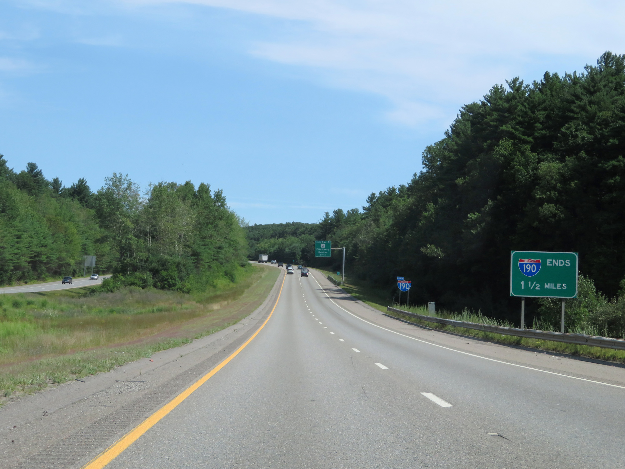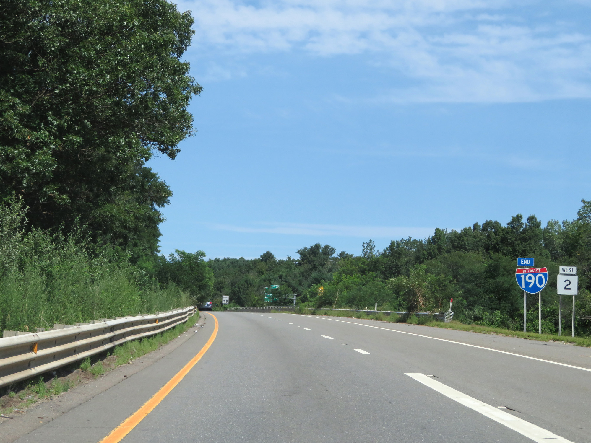 Interstate 190 North ends 1 1/2 miles ahead, at the junction of MA 2. (Photo taken 8/6/17). |