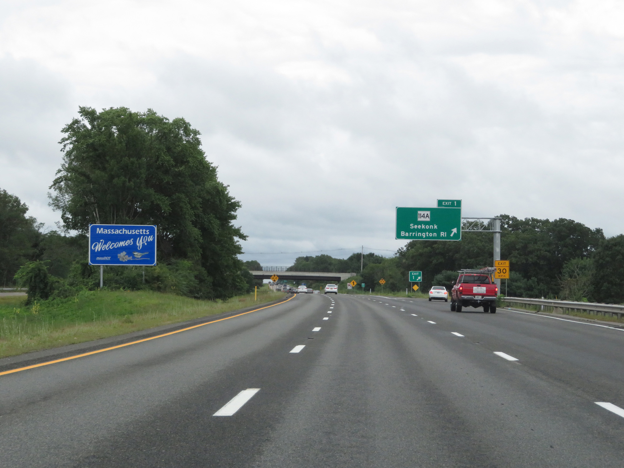 Massachusetts welcome sign on Interstate 195 East approaching Exit 1. (Photo taken 8/5/17). |