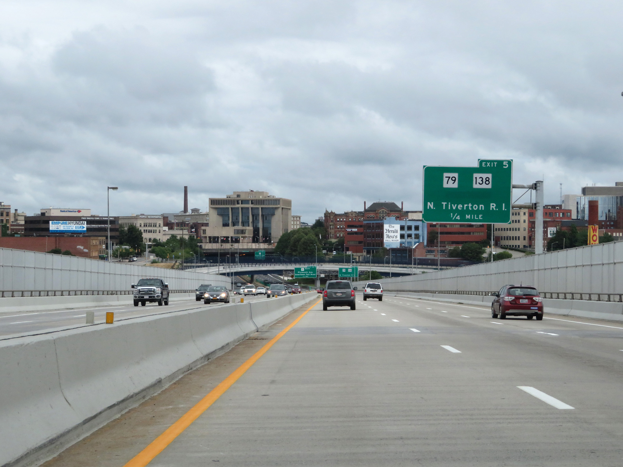 Approaching Exits 6-7, Interstate 195 East prepares to briefly tunnel underneath South Main St and Fall River City Hall. (Photo taken 8/5/17). |