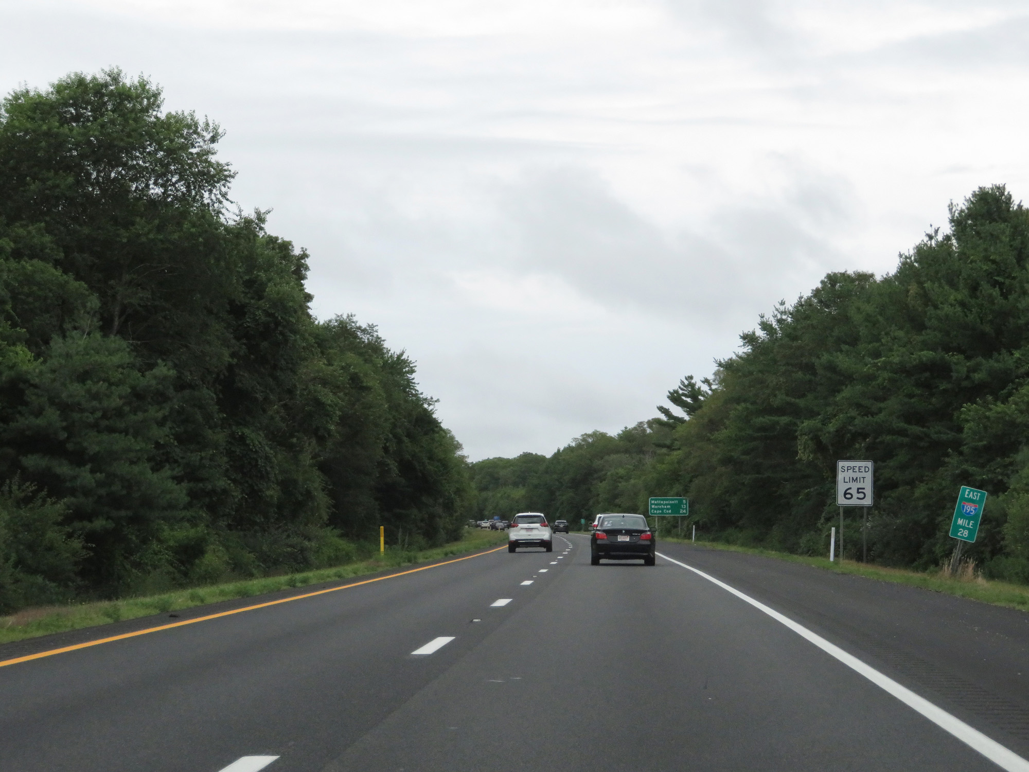The speed limit on Interstate 195 East starts out at 65 mph. This is the standard speed limit on most rural Interstate highways in Massachusetts. (Photo taken 8/5/17). |