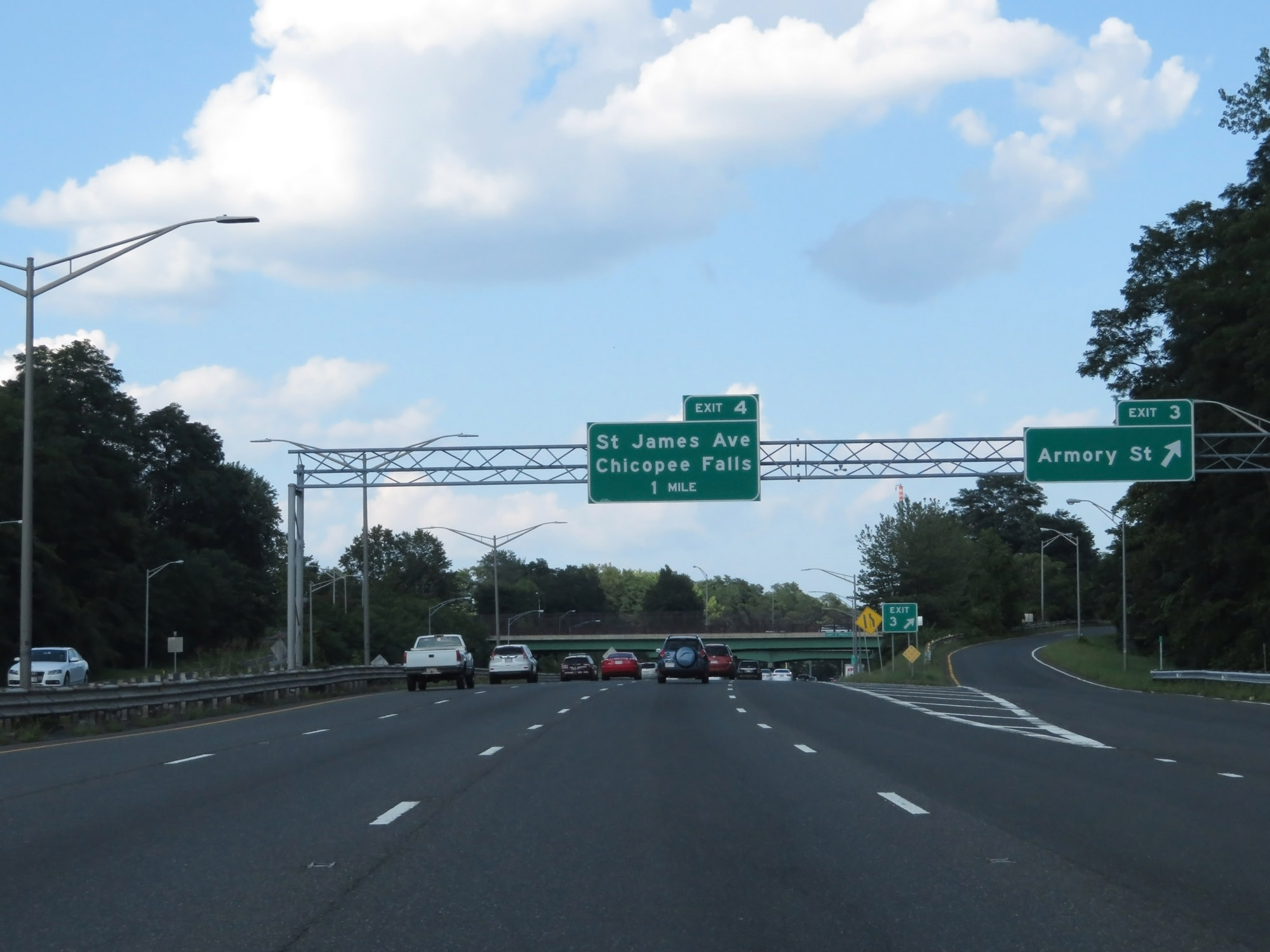 Interstate 291 East at Exit 4: St James Ave / Chicopee Falls (Photo taken 8/9/17). |