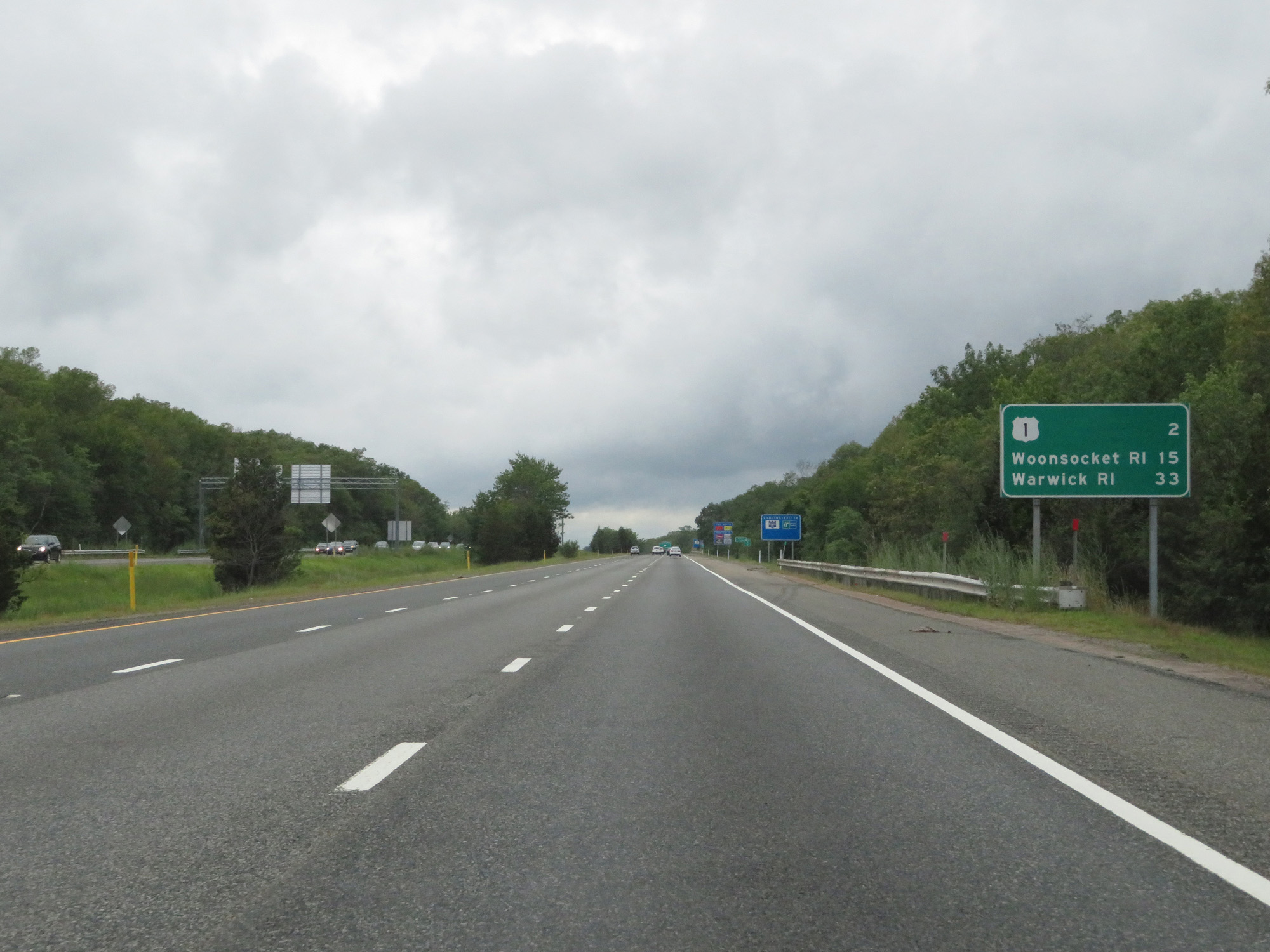 Mileage sign on Interstate 295 South. It's 2 miles to the junction of US 1, 15 miles to Woonsocket, RI and 33 miles to Warwick, RI. (Photo taken 8/5/17). |