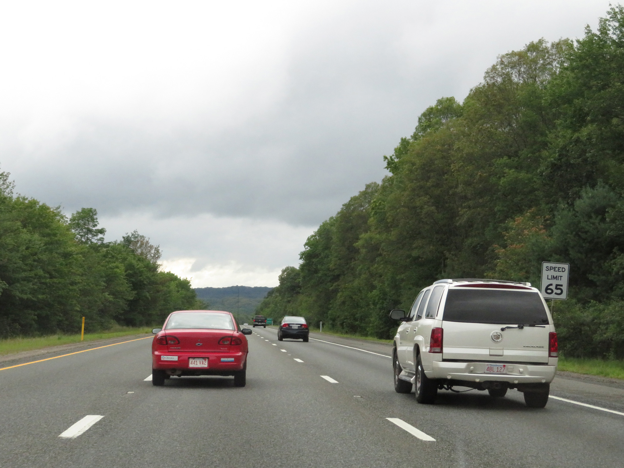 The speed limit on Interstate 295 is 65 mph. This is the standard speed limit on most rural Interstate highways in Massachusetts. (Photo taken 8/5/17). |