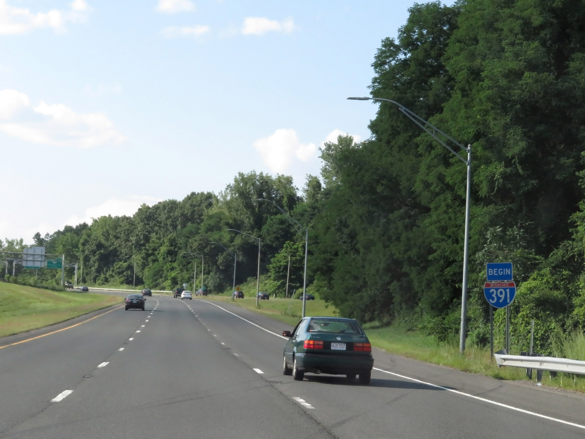 Merging onto Interstate 391 North from Interstate 91 North, this BEGIN marker is seen. (Photo taken 8/9/17). |