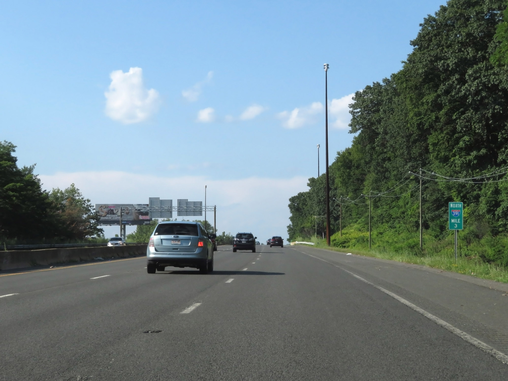 Interstate 391 North approaching Exit 3 - 1/4 mile. (Photo taken 8/9/17). |