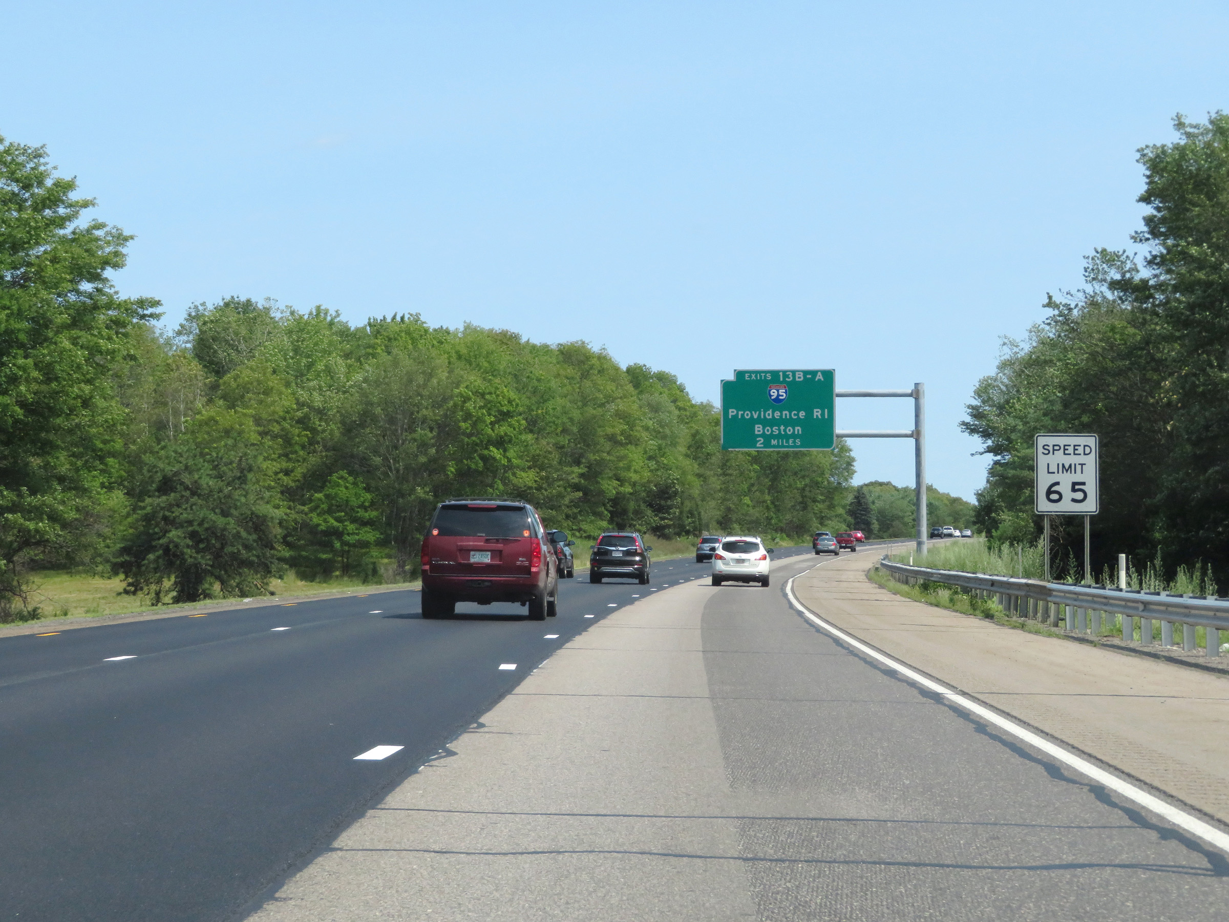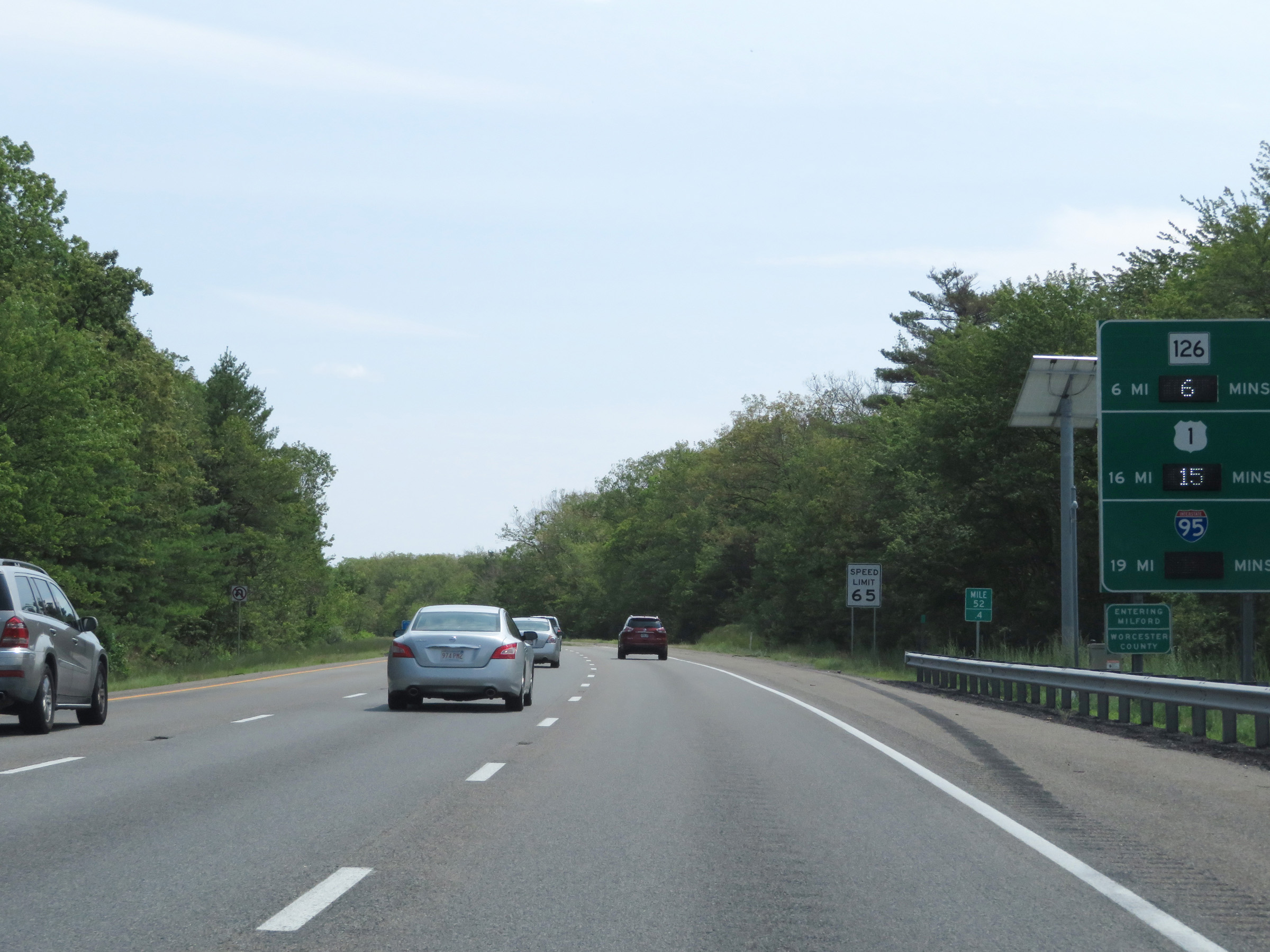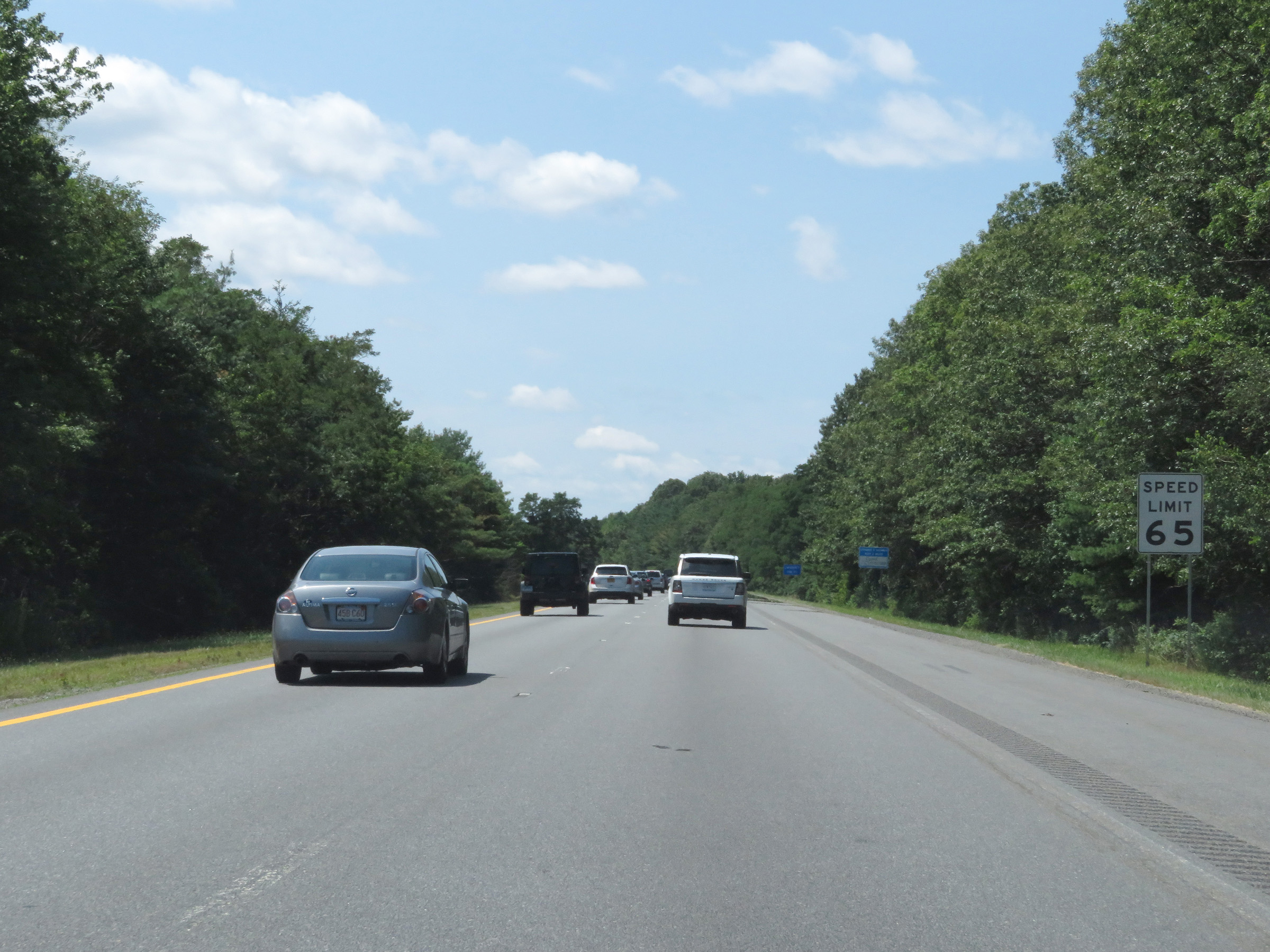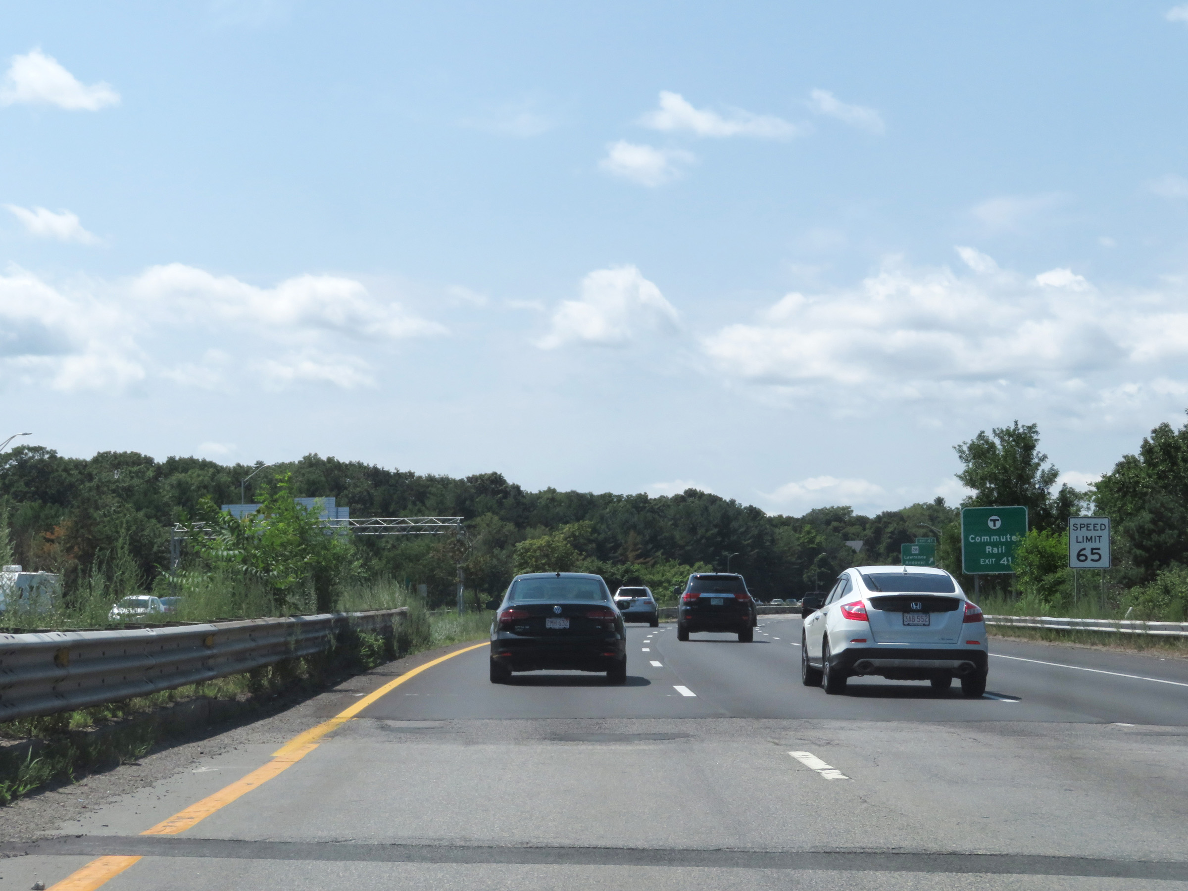 The speed limit on Interstate 495 South starts at 65 mph. This is the standard speed limit on most rural Interstate highways in Massachusetts. (Photo taken 8/6/17). |