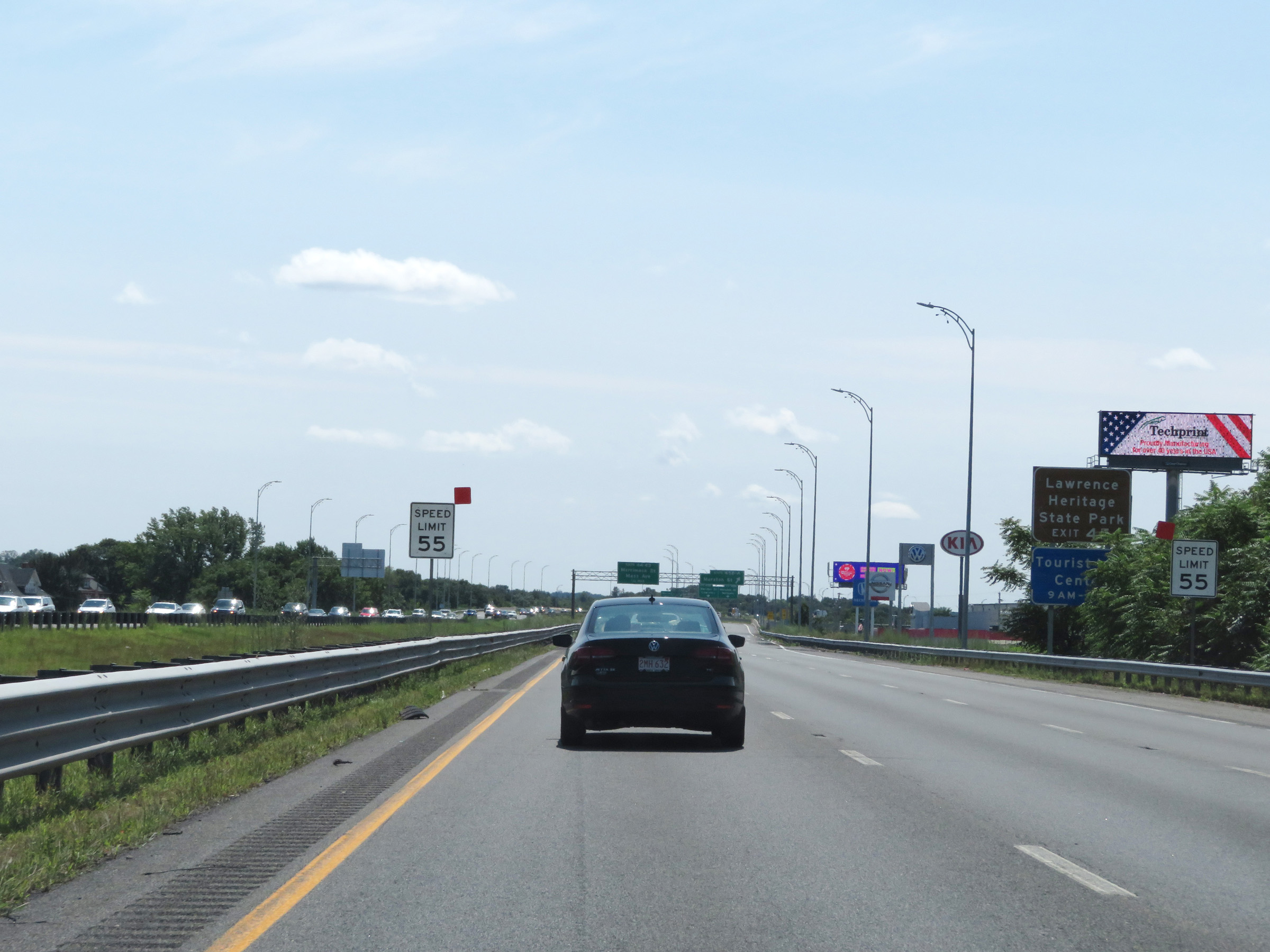 Approaching Exits 45B-A, the speed limit decreases to 55 mph. Take Exit 45A to Lawrence Heritage State Park. (Photo taken 8/6/17). |