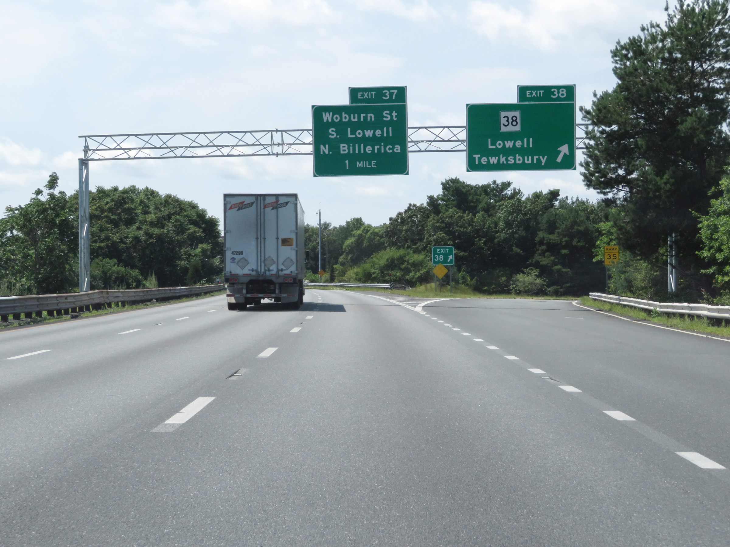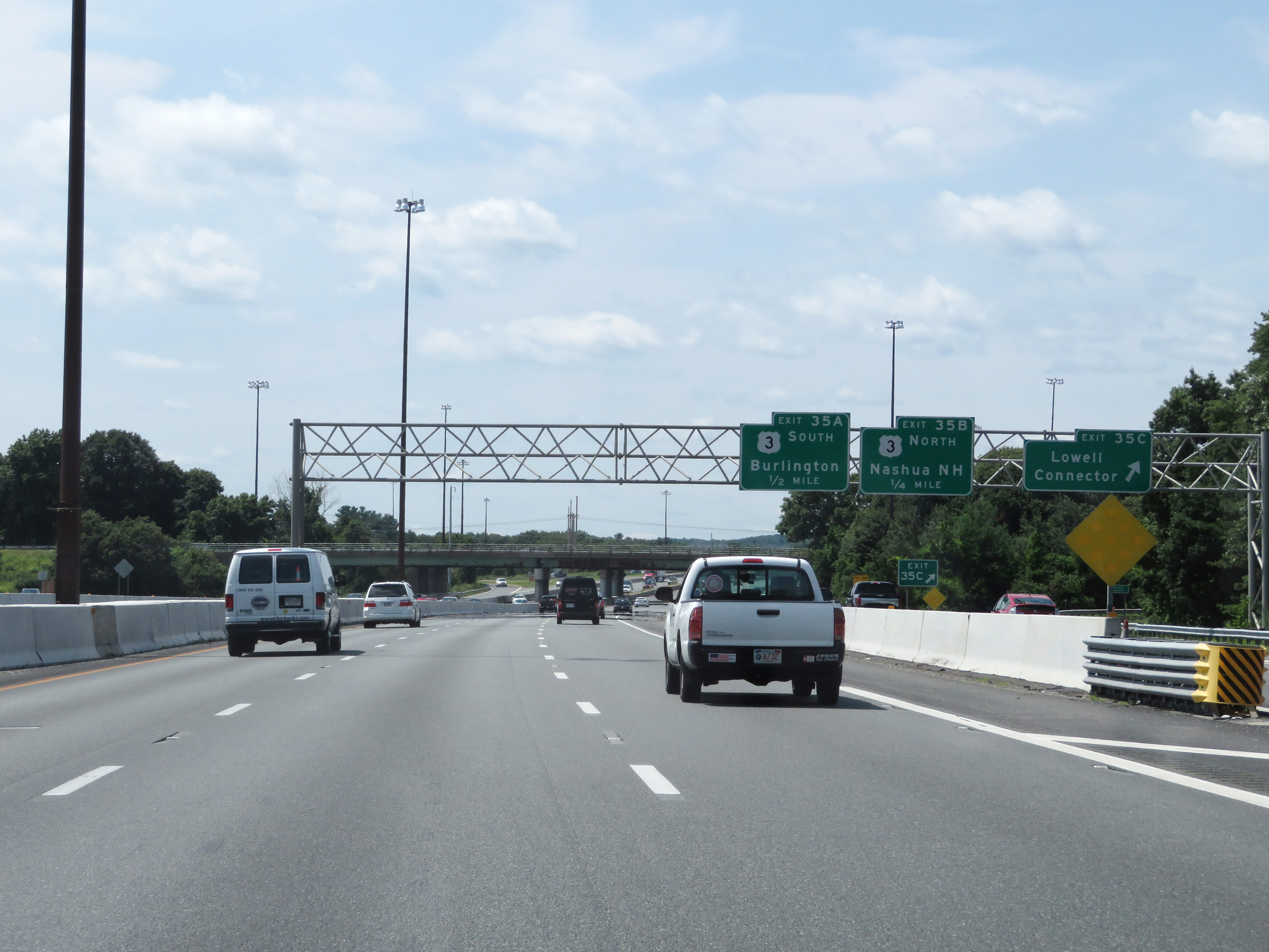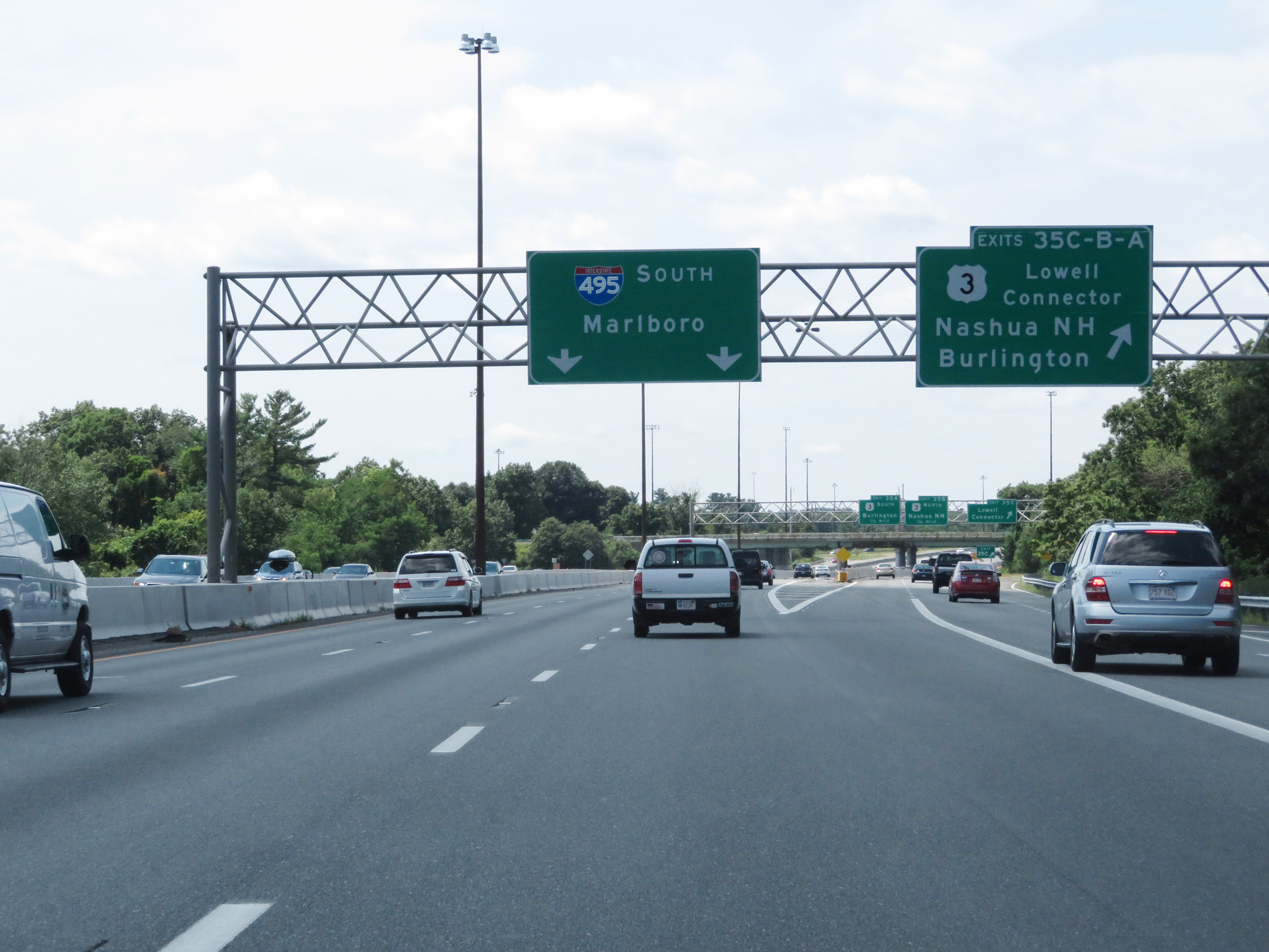 Interstate 495 South at Exits 35C-B-A: US 3 - Lowell Connector / Nashua, NH / Burlington (Photo taken 8/6/17). |