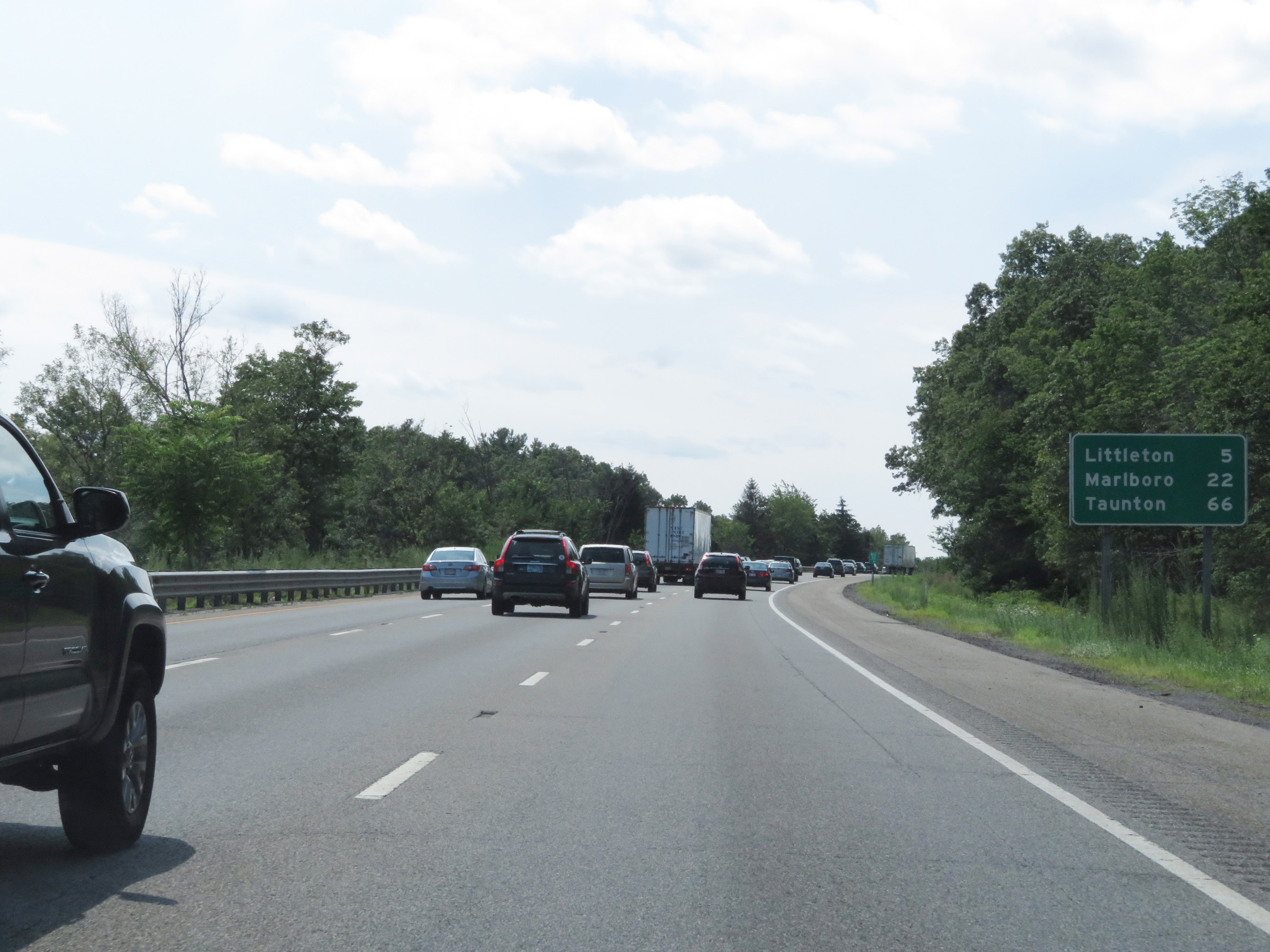 Another mileage sign on Interstate 495 South. It's 5 miles to Littleton, 22 miles to Marlboro, and 66 miles to Taunton. (Photo taken 8/6/17). |