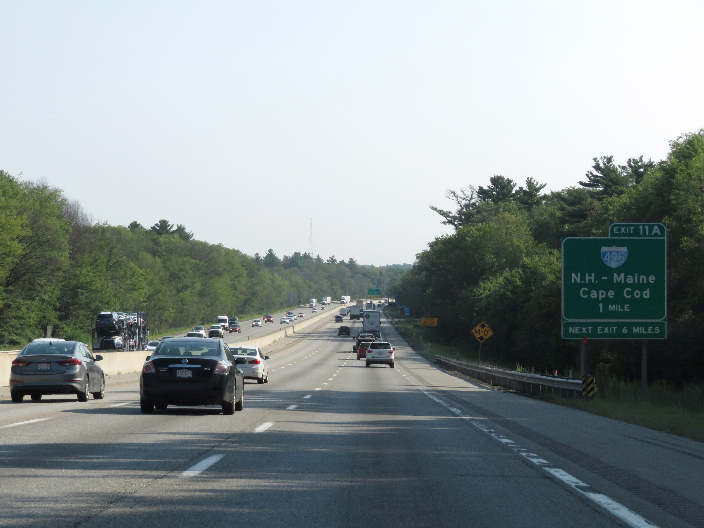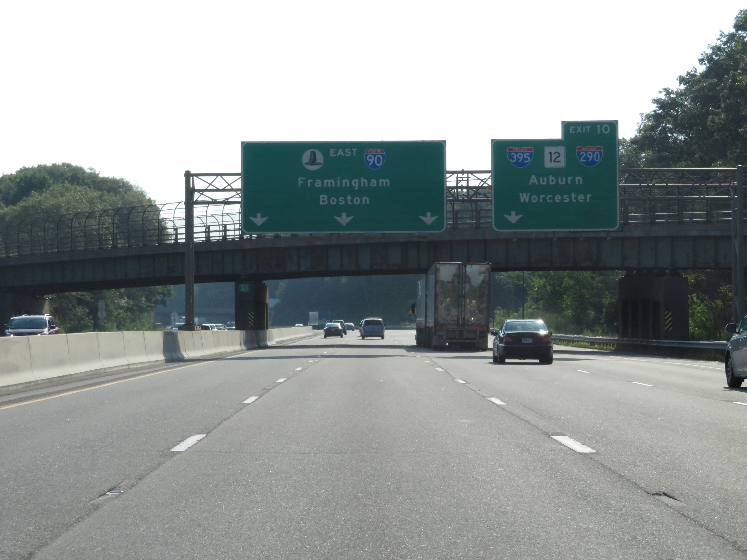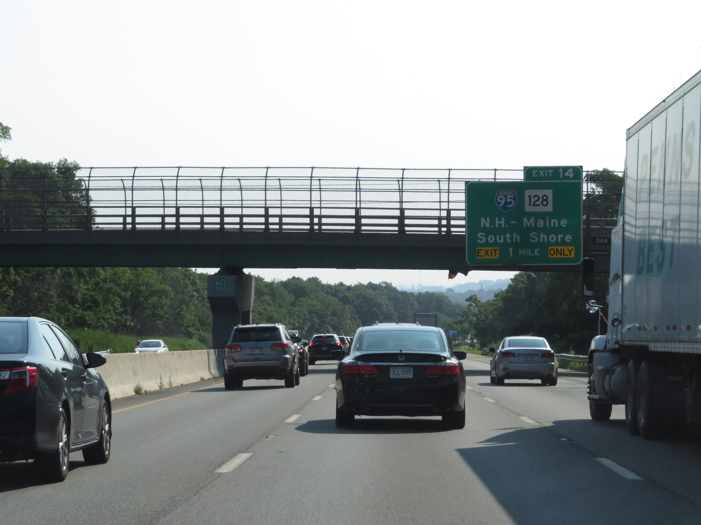 Interstate 90 East (Mass Pike) at Exit 14: Interstate 95 / MA 128 - New Hampshire-Maine / South Shore (Photo taken 8/10/17). |