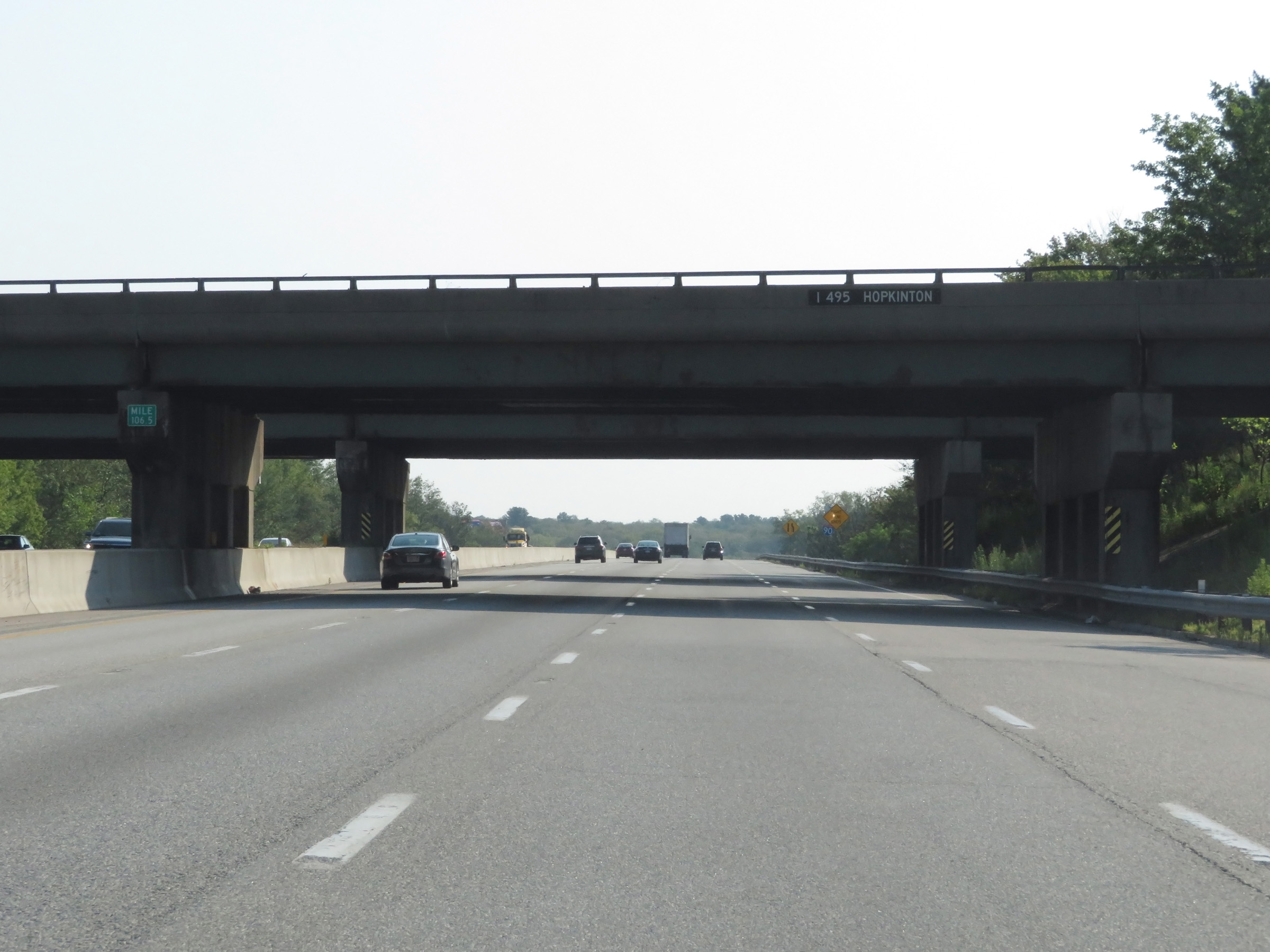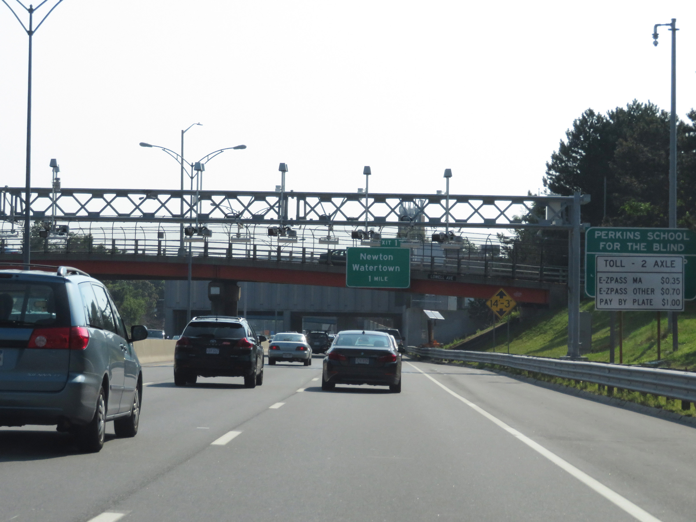 Interstate 90 East (Mass Pike) at the toll gantry in Newton. (Photo taken 8/10/17). |