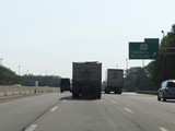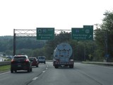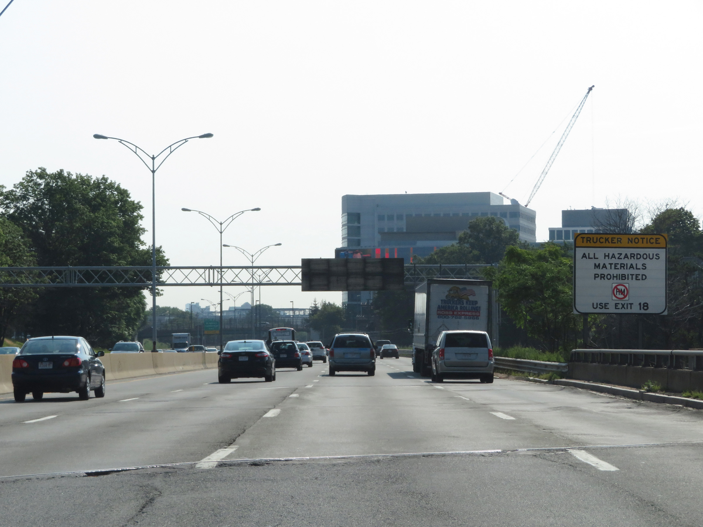 Due to the upcoming tunnels on Interstate 90 East (Mass Pike) in downtown Boston, trucks hauling hazardous materials, regardless of class or amount, must use Exit 18. (Photo taken 8/10/17). |