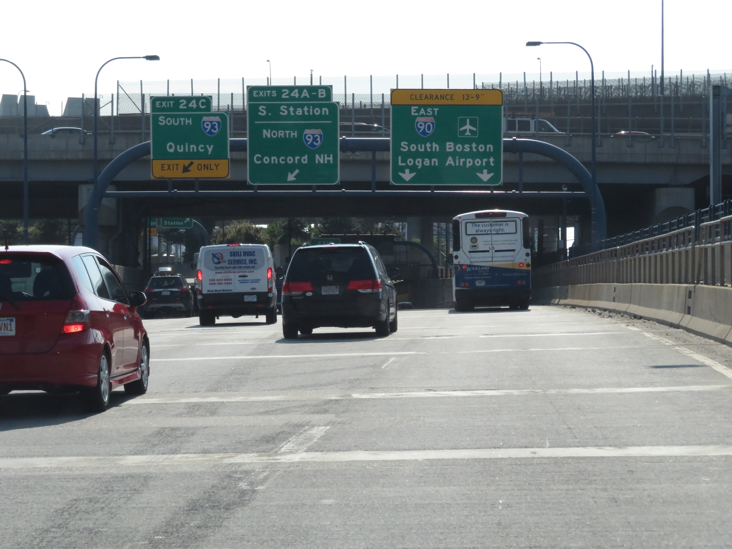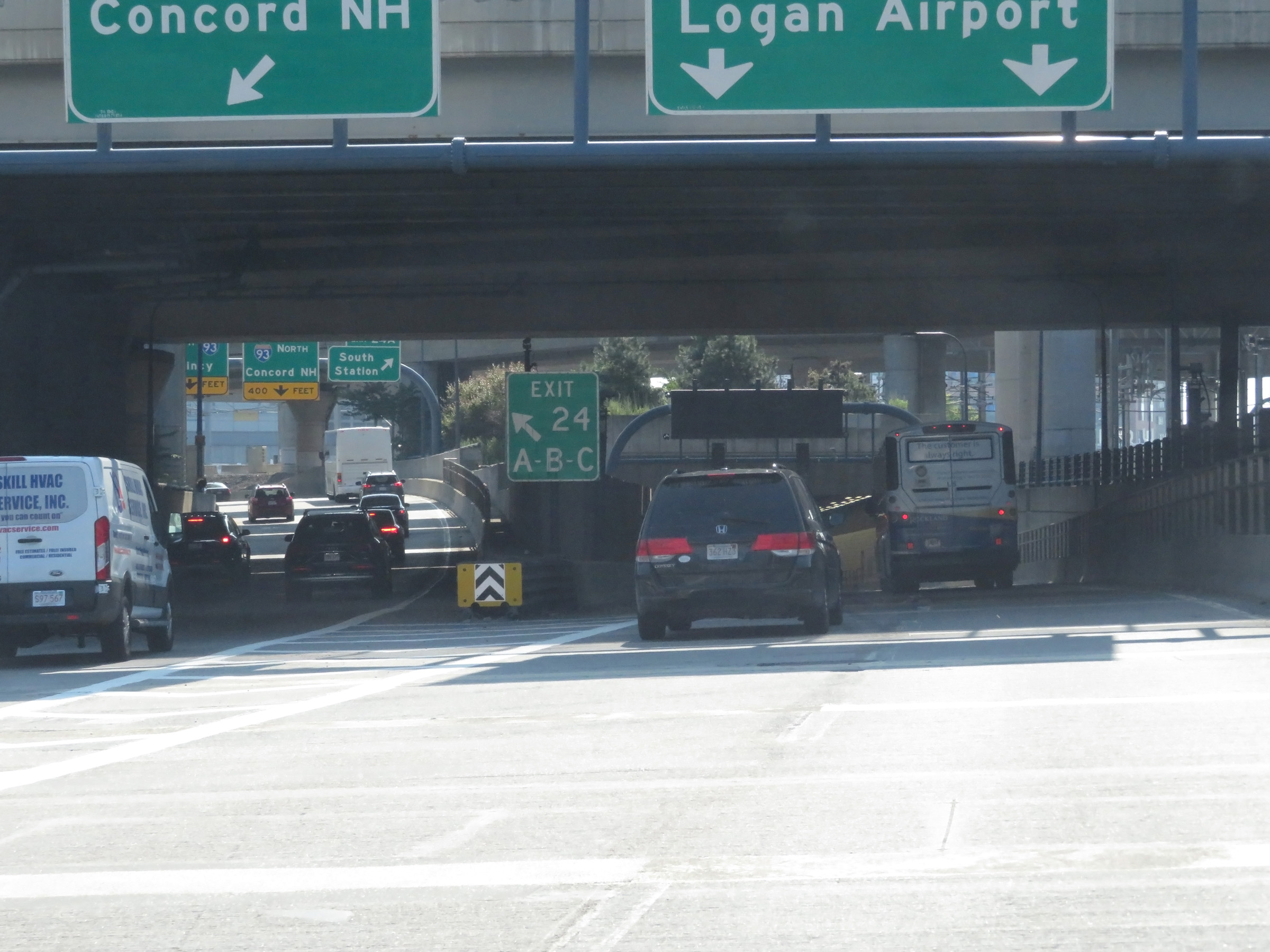 Interstate 90 East (Mass Pike) at Exit 24A: South Station; Exit 24B: Interstate 93 North - Concord, NH; Exit 24C: Interstate 93 South - Quincy (Photo taken 8/10/17). |
