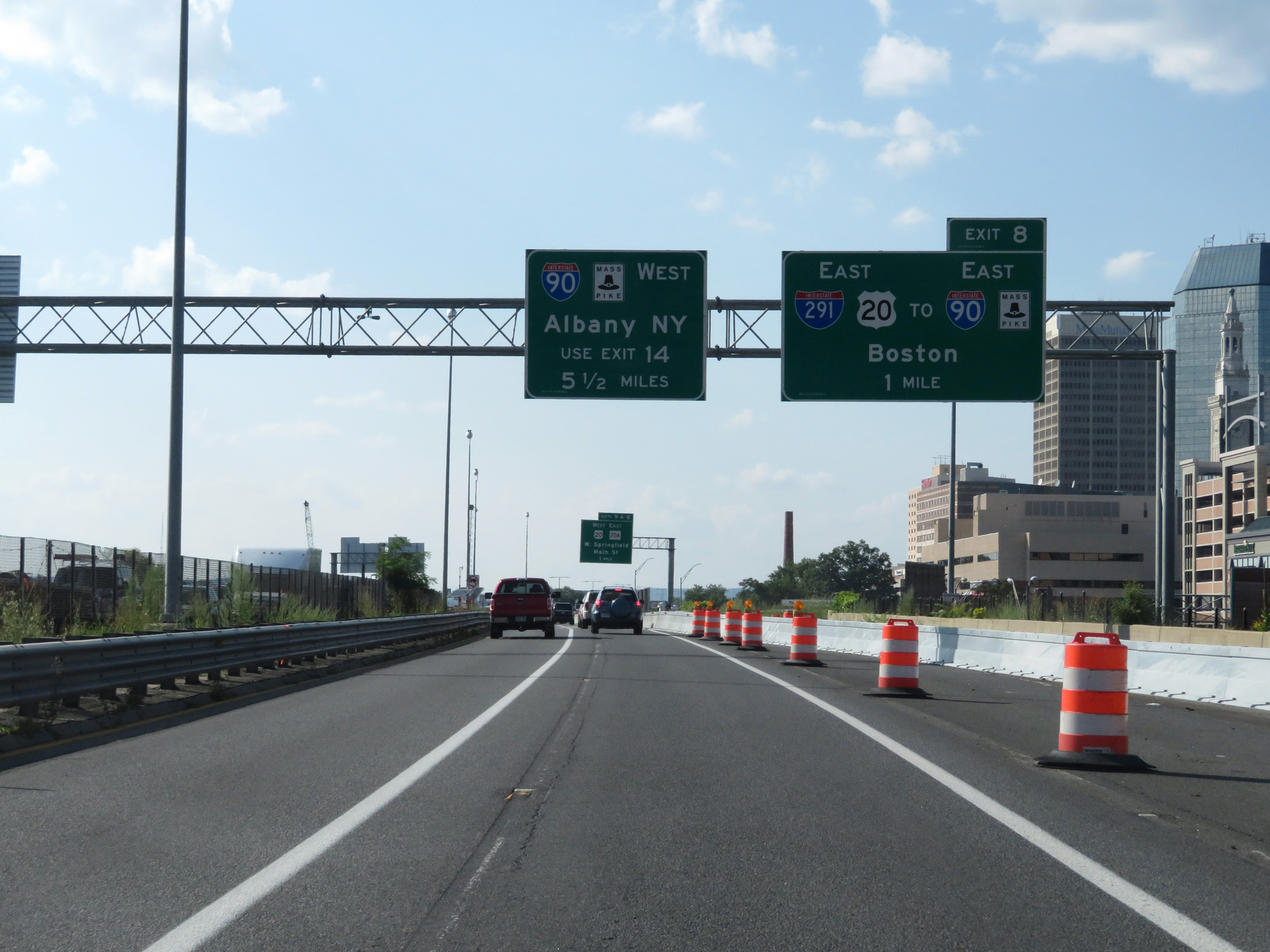 Interstate 91 North at Exit 8: Interstate 291 East / US 20 East / To Interstate 90 East - Mass Pike (Photo taken 8/9/17). |