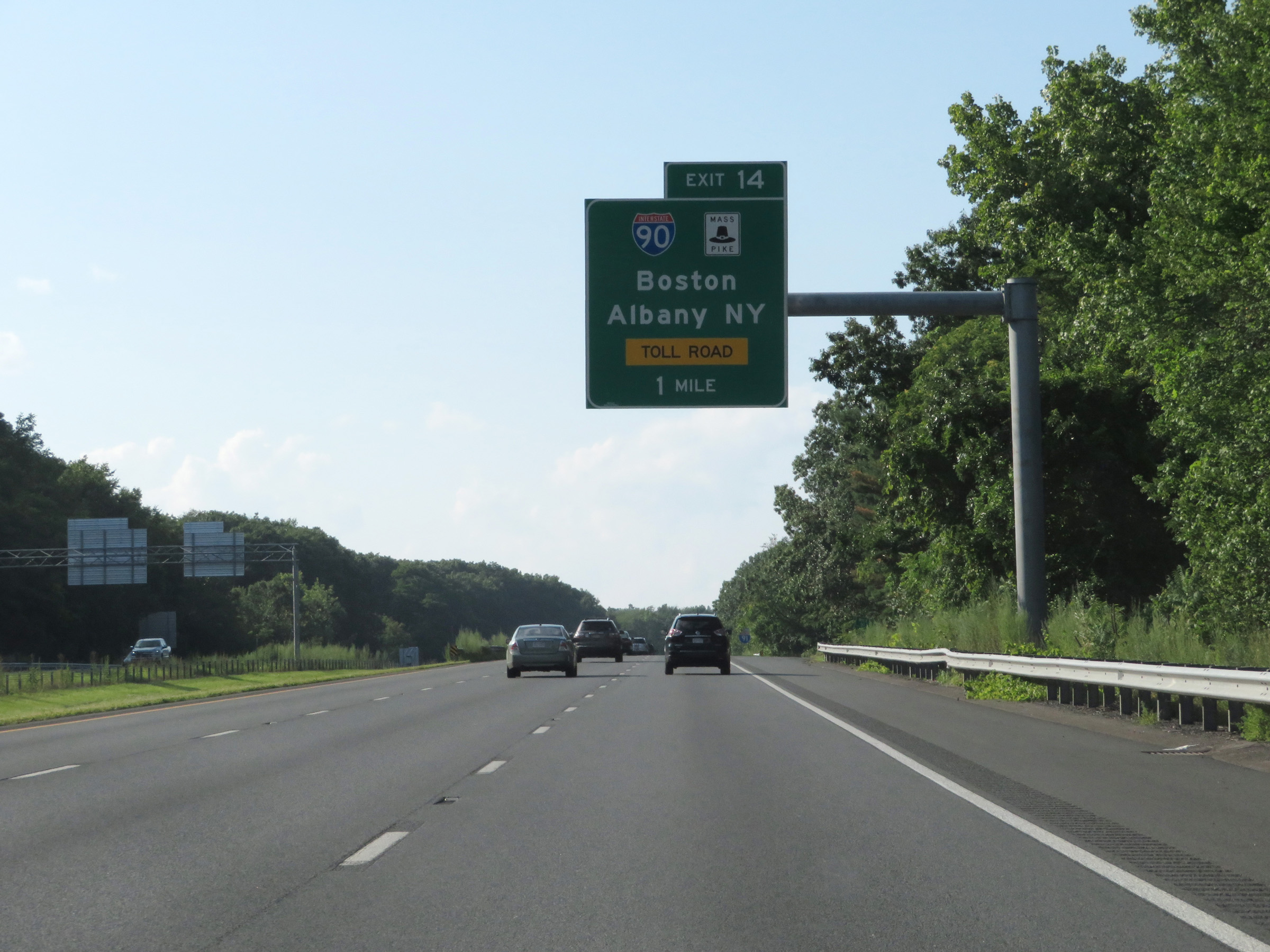 Interstate 91 North at Exit 14: Interstate 90 (Mass Pike) - Boston / Albany, NY (Photo taken 8/9/17). |