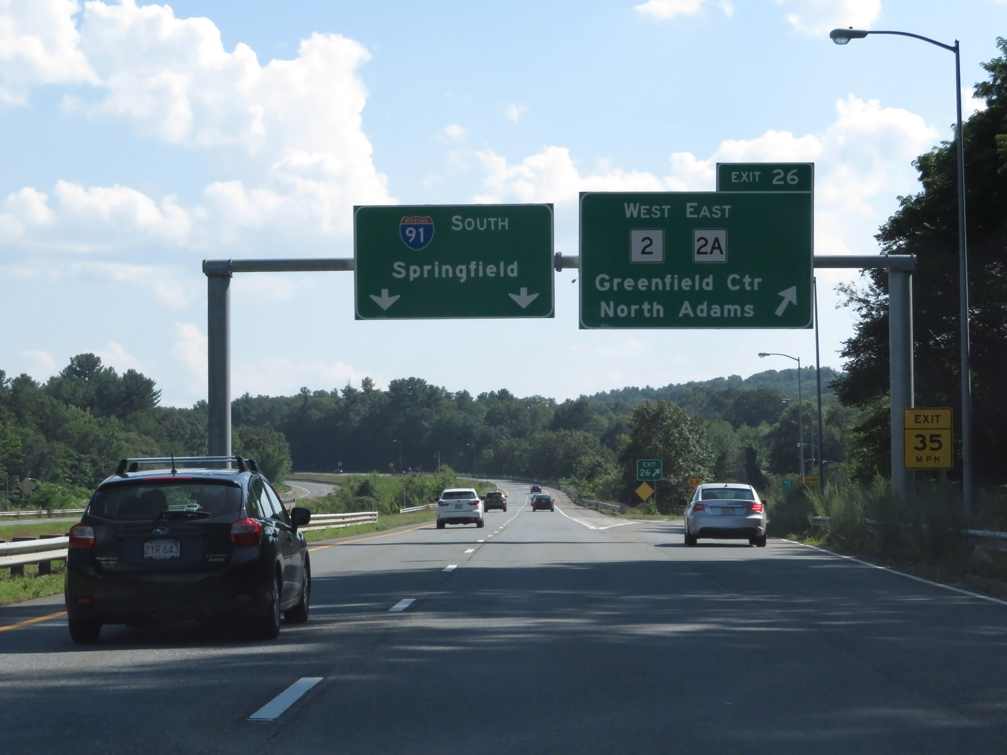Interstate 91 South at Exit 26: MA 2 West / MA 2A East - Greenfield Center / North Adams (Photo taken 8/9/17). |