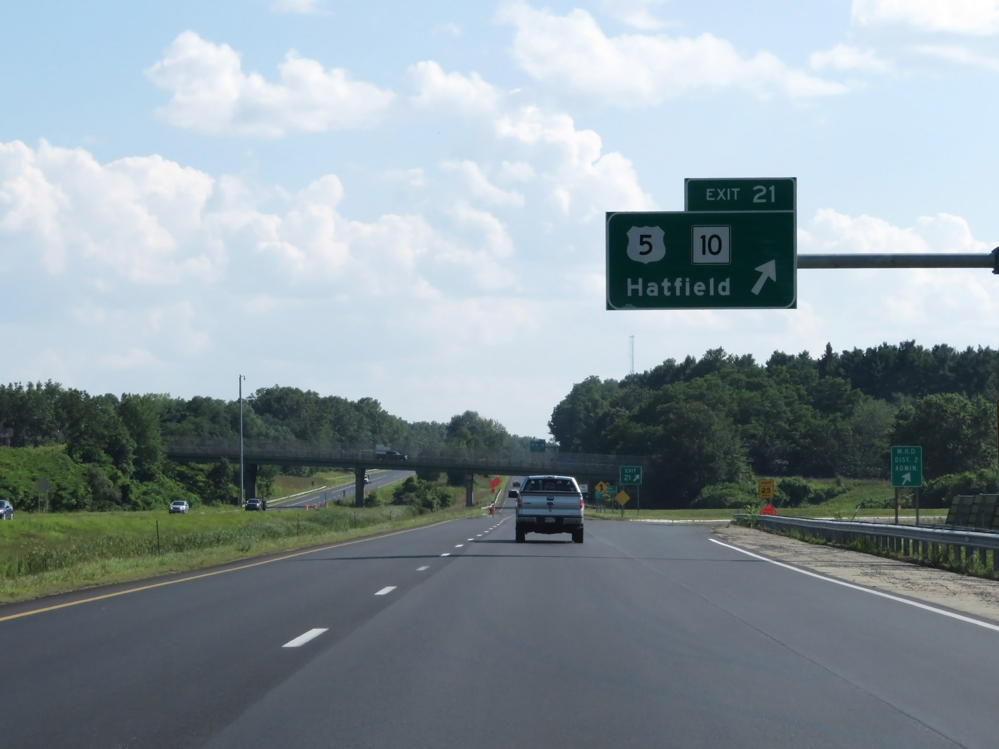 Interstate 91 South at Exit 21: US 5 / MA 10 - Hatfield (Photo taken 8/9/17). |