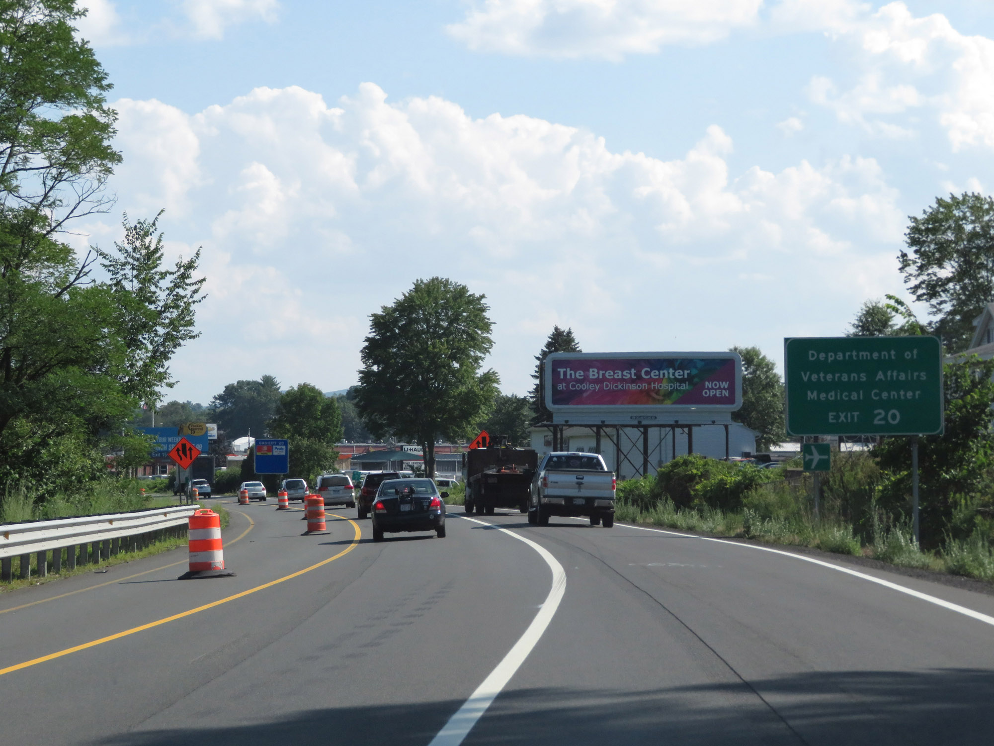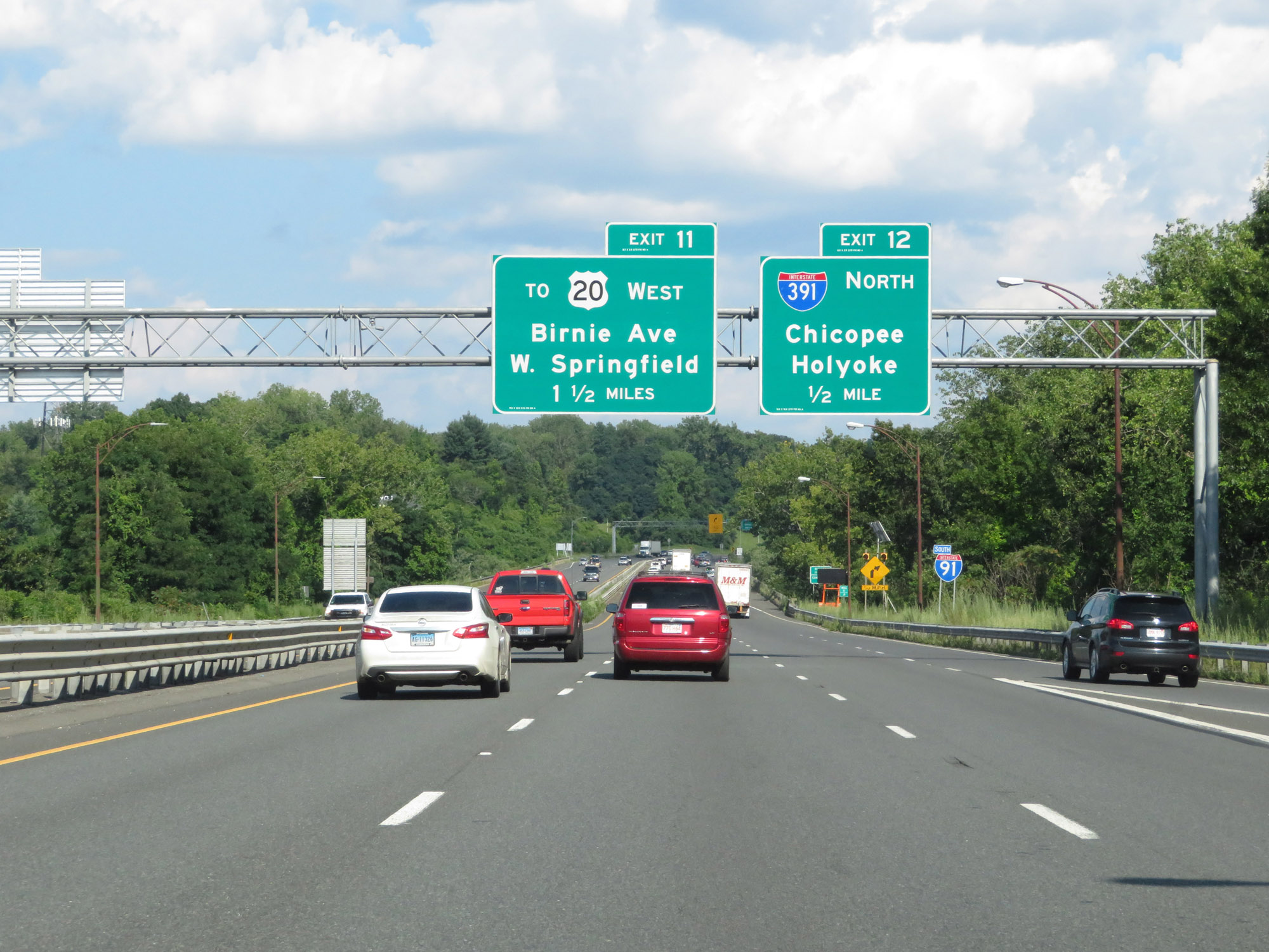 Interstate 91 South at Exit 11: To US 20 West - Birnie Ave / West Springfield (Photo taken 8/9/17). |