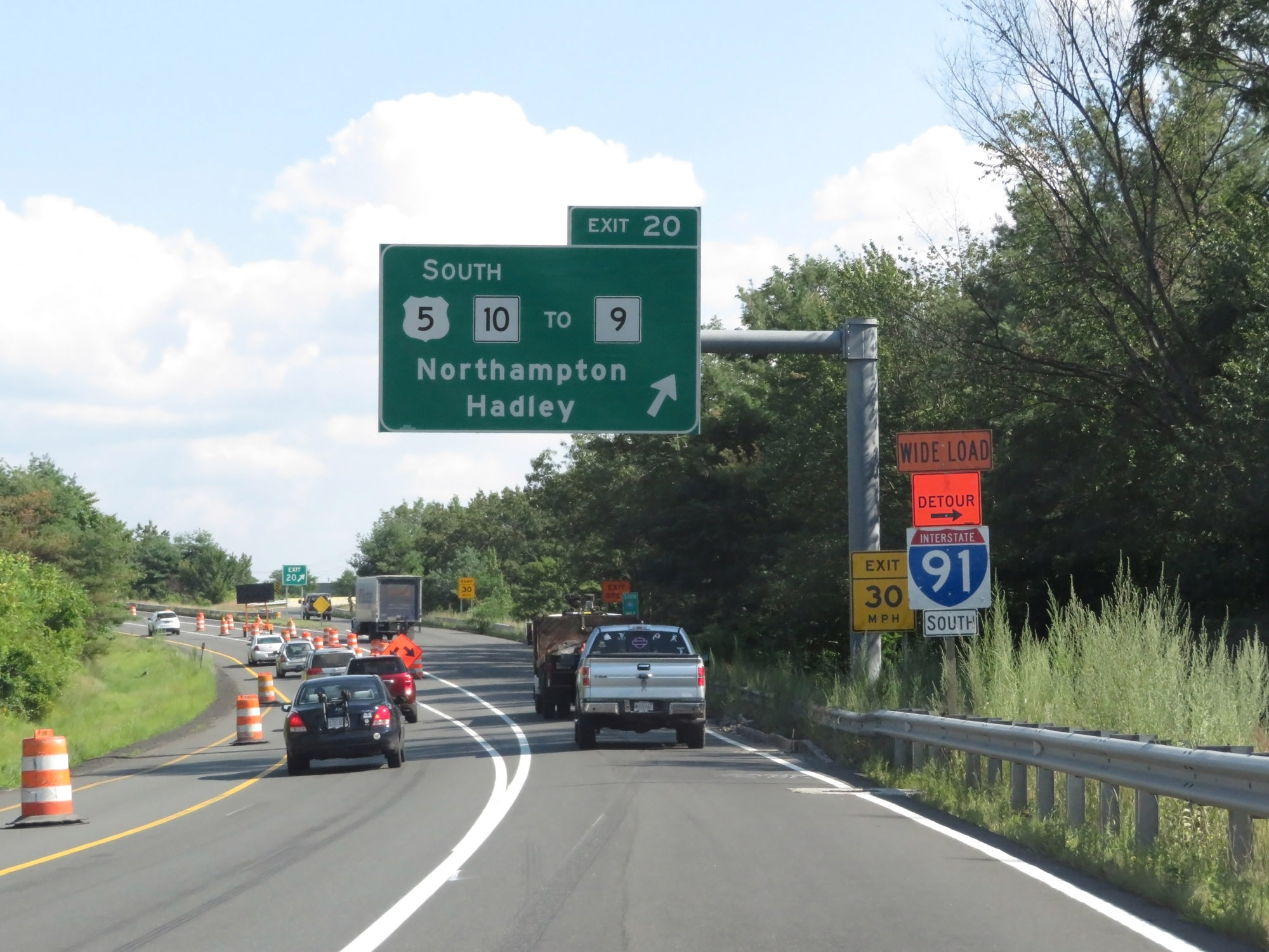 Interstate 91 South at Exit 20: US 5 South / MA 10 South / To MA 9 - Northampton / Hadley (Photo taken 8/9/17). |