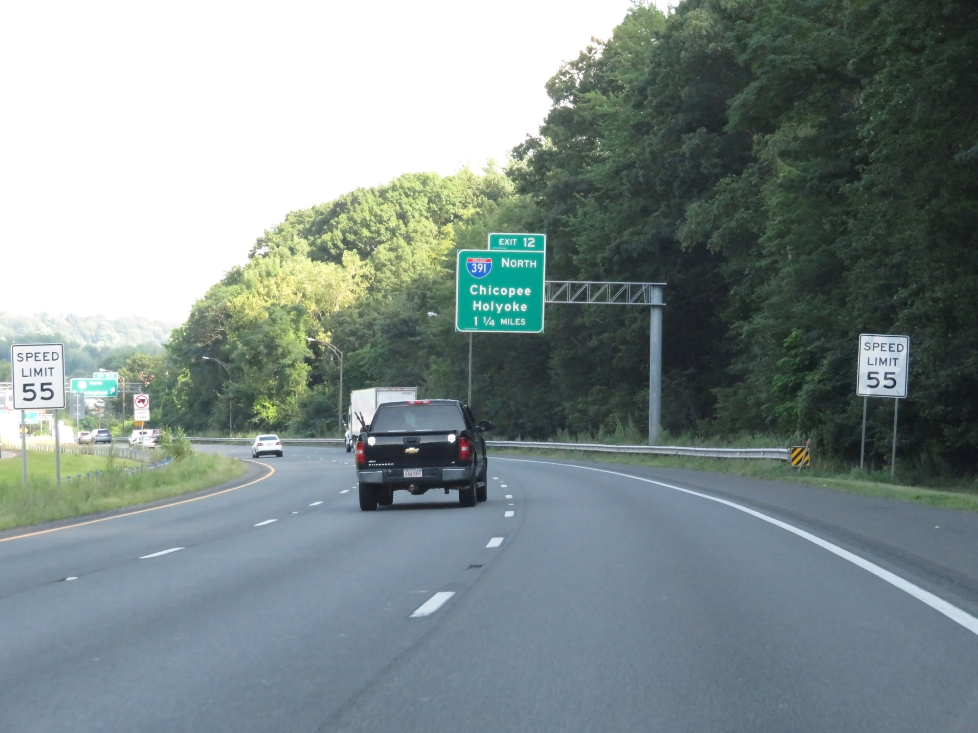 Interstate 91 South at Exit 12: Interstate 391 North - Chicopee / Holyoke. The speed limit decreases to 50 mph at this point, approaching a sharp curve. (Photo taken 8/9/17). |