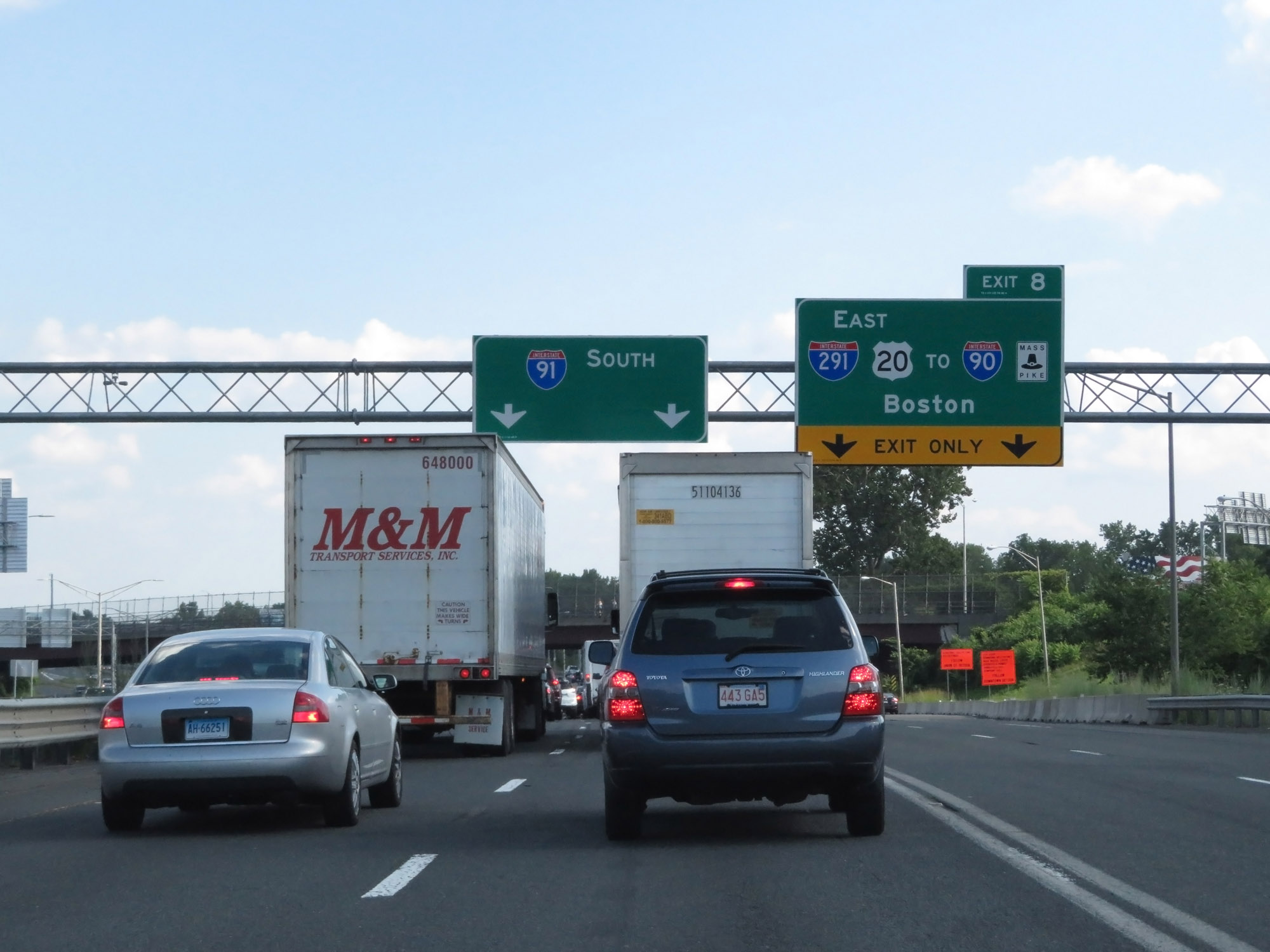 Interstate 91 South at Exit 8: Interstate 291 East / US 20 East / To Interstate 90 (Mass Pike) - Boston (Photo taken 8/9/17). |