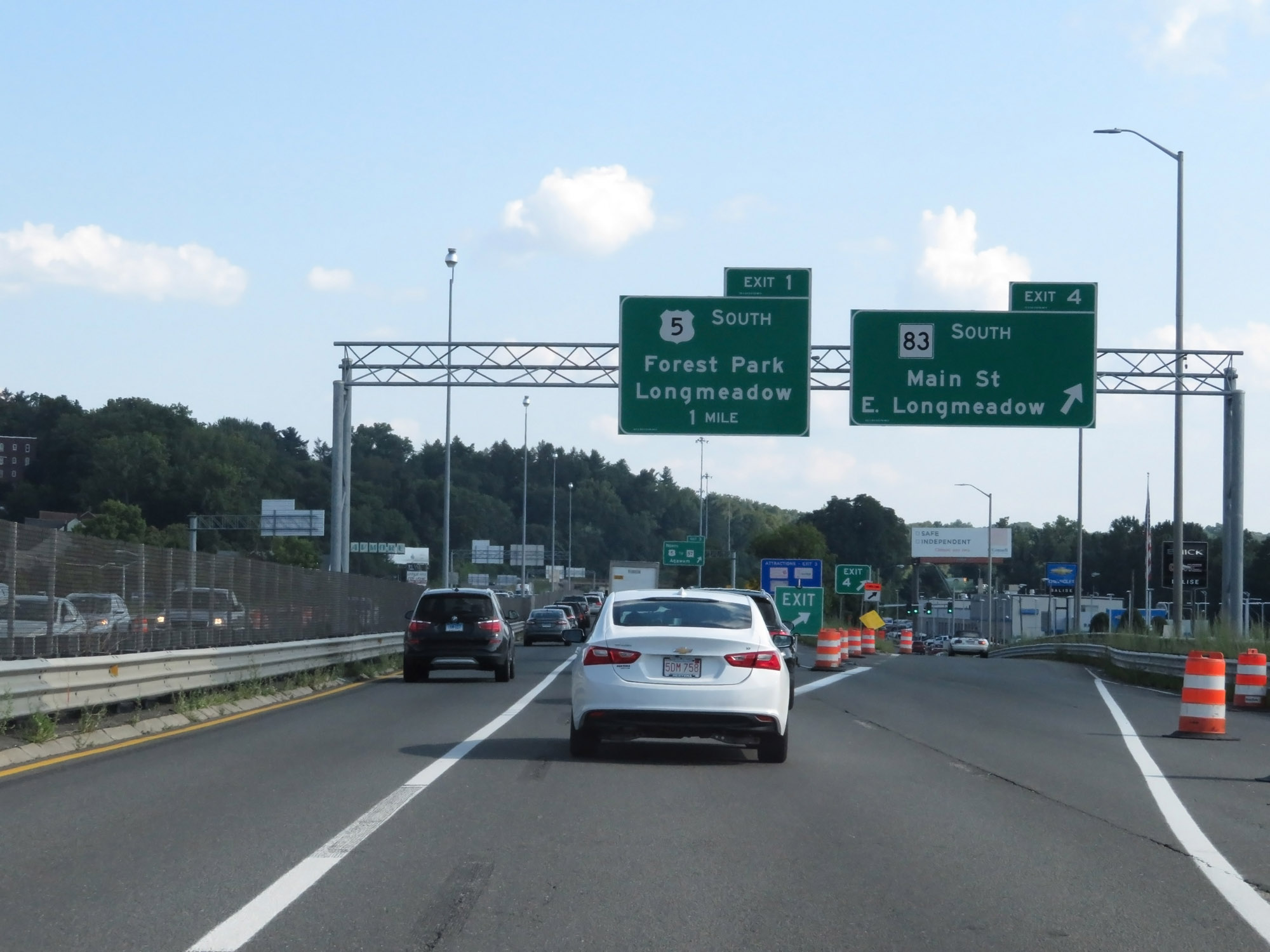 Interstate 91 South at Exit 4: MA 83 South - Main St / East Longmeadow (Photo taken 8/9/17). |