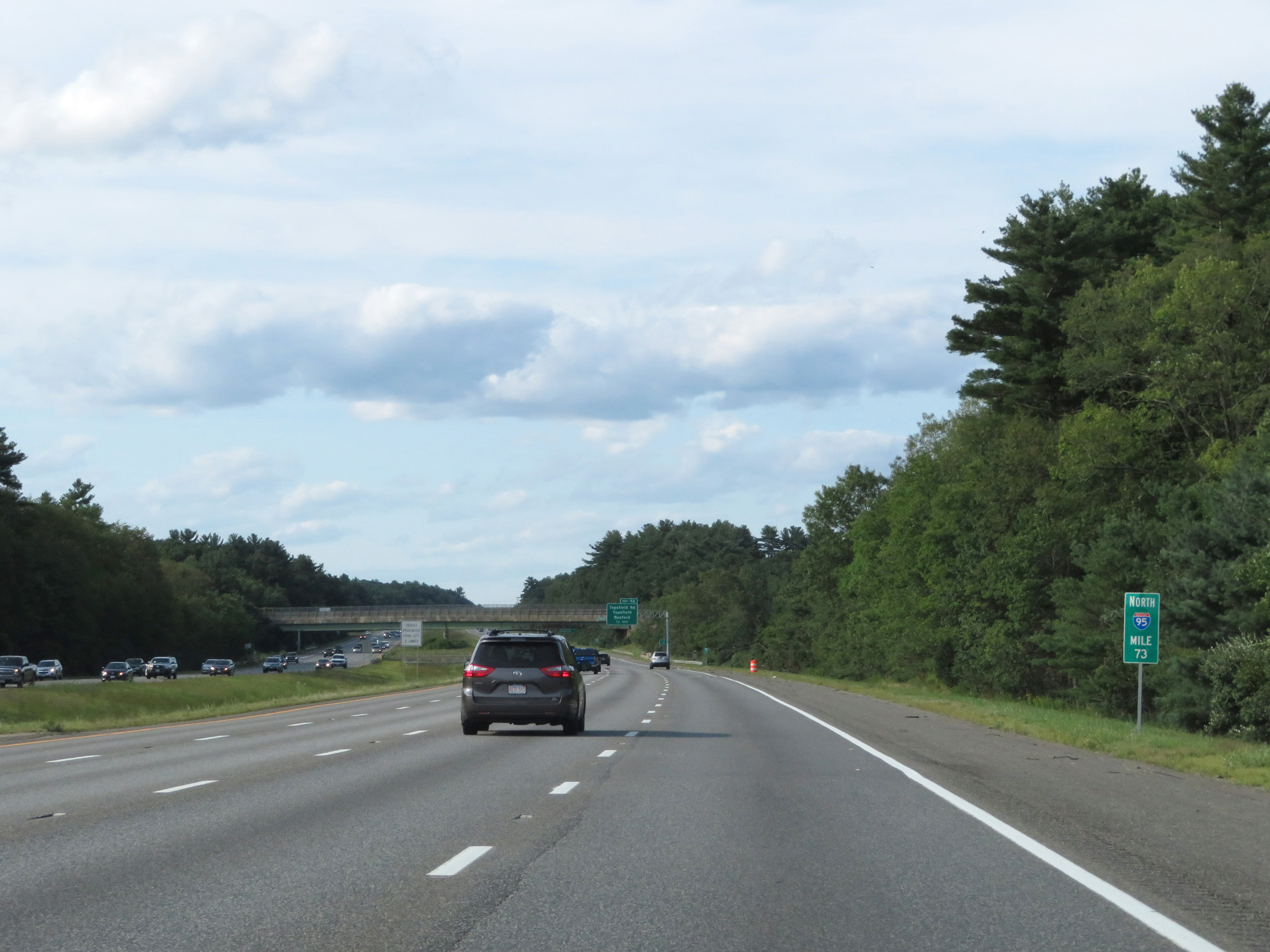 The speed limit on Interstate 95 North starts out at 65 mph. This is the standard speed limit on most rural Interstate highways in Massachusetts. (Photo taken 8/5/17). |