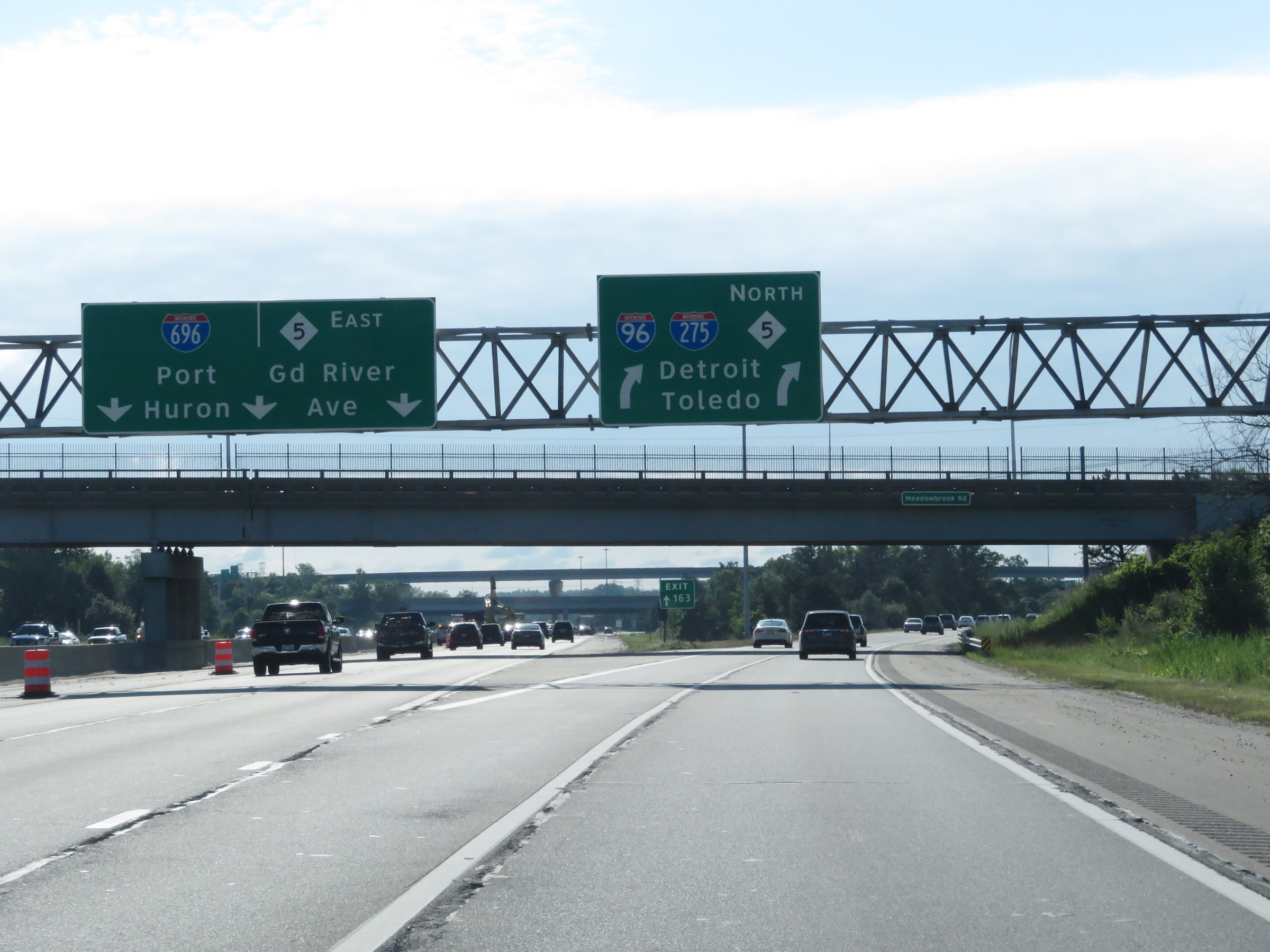 Interstate 275 South begins here, at Exit 163 on Interstate 96 East. Interstate 696 East begins at this same interchange. (Photo taken 7/15/17). |
