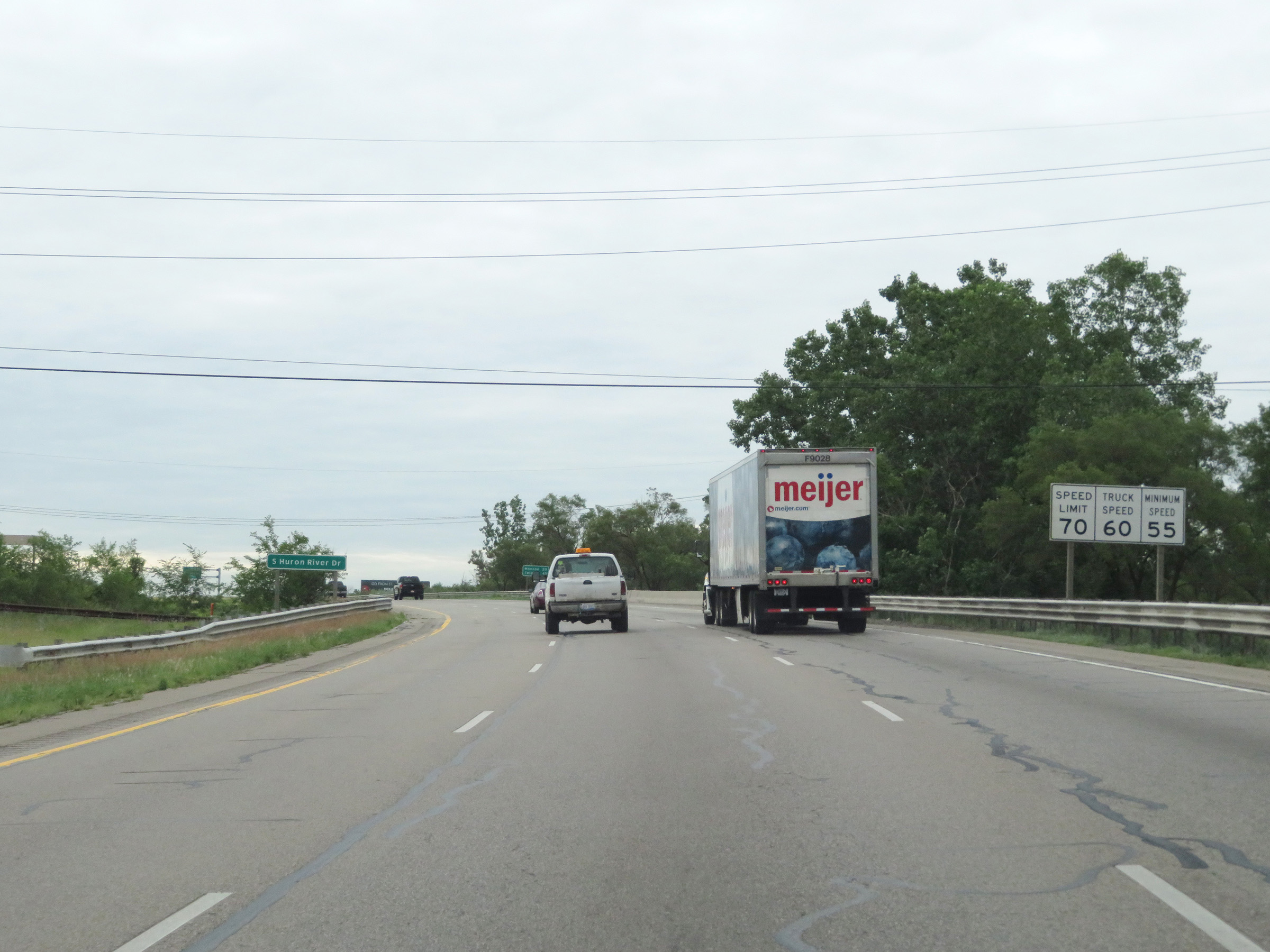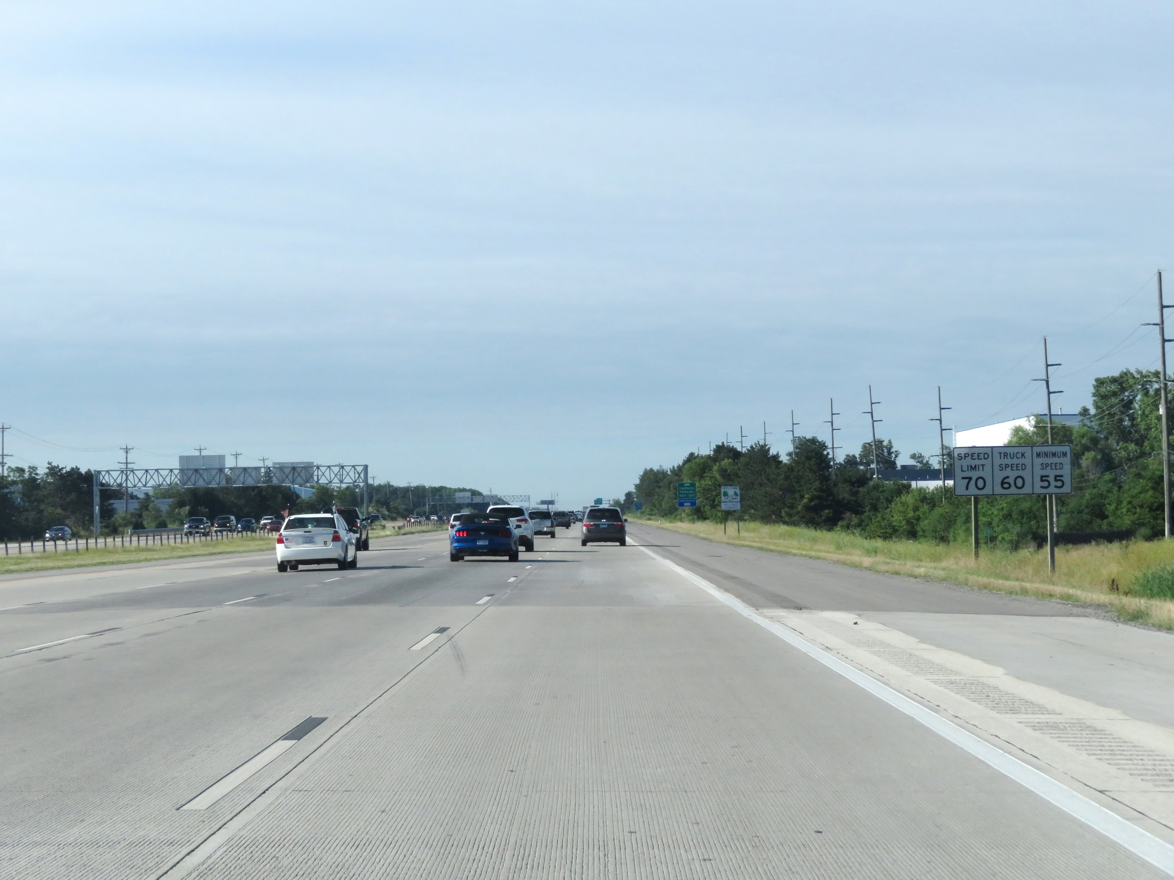 Speed limit signs on Interstate 275 South / Interstate 96 East. The maximum speed limit starts out at 70 mph, the truck speed limit is 60 mph, and the minimum speed limit is 55 mph. These are the standard speed limits on most rural Interstate highways in Michigan. (Photo taken 7/15/17). |