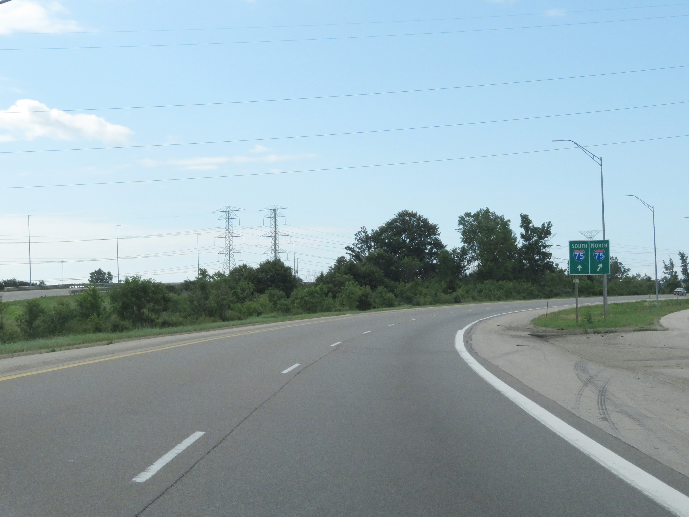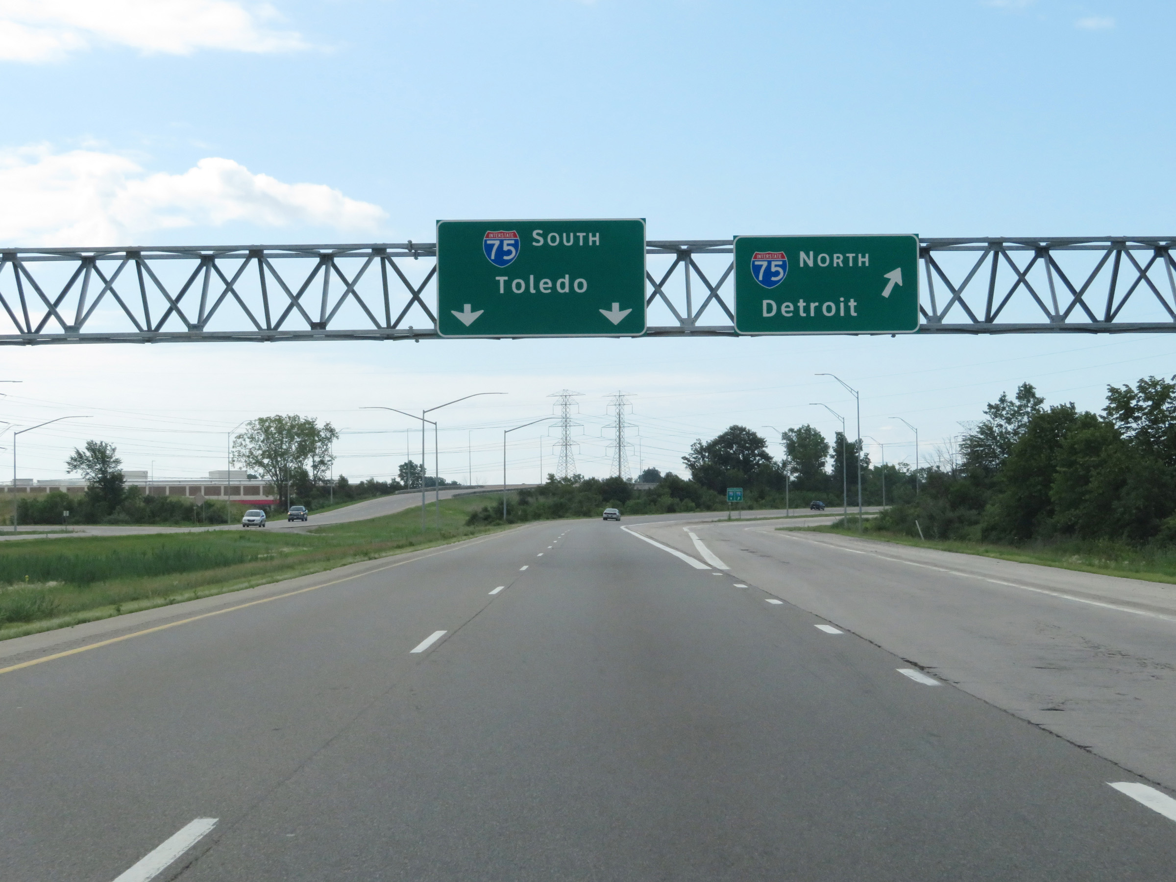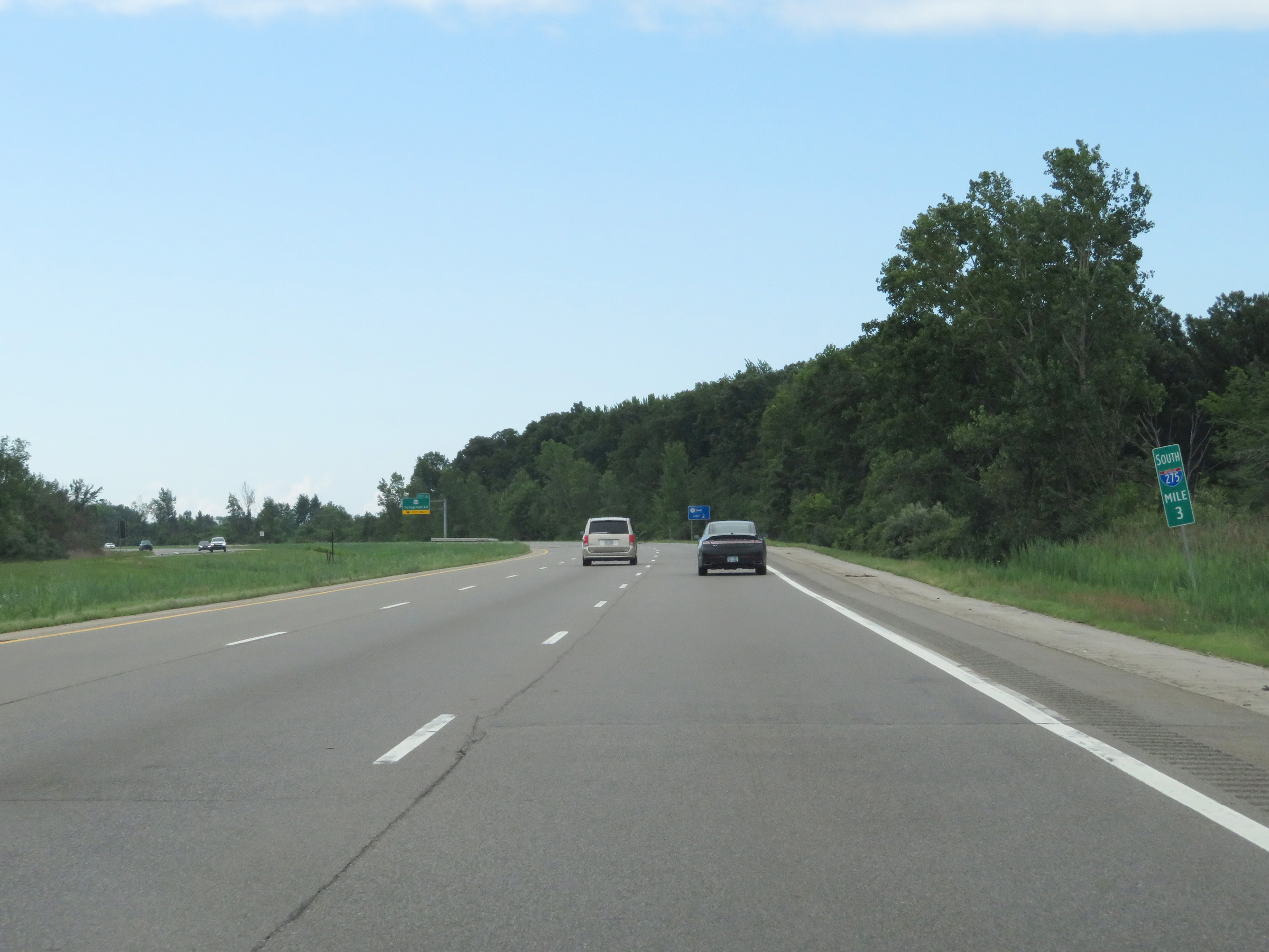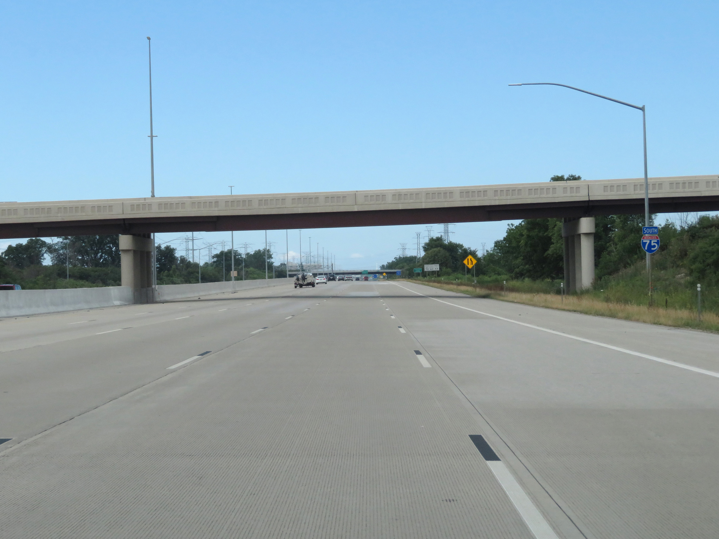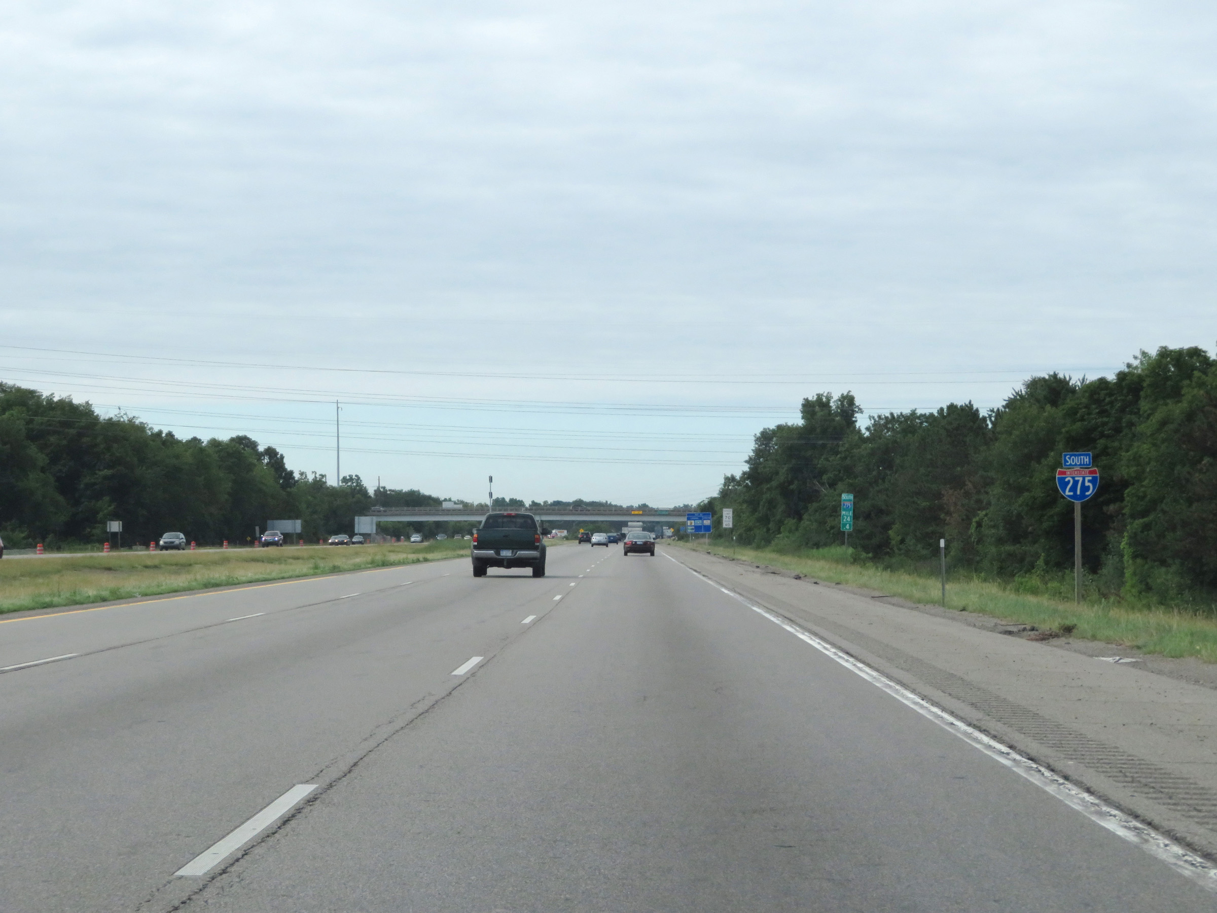 Interstate 275 South at the junction of Interstate 75, which marks the southern terminus of I-275. Traffic to I-75 North toward Detroit will exit off to the right here, while traffic to I-75 South toward Toledo can stay straight. (Photo taken 7/15/17). |