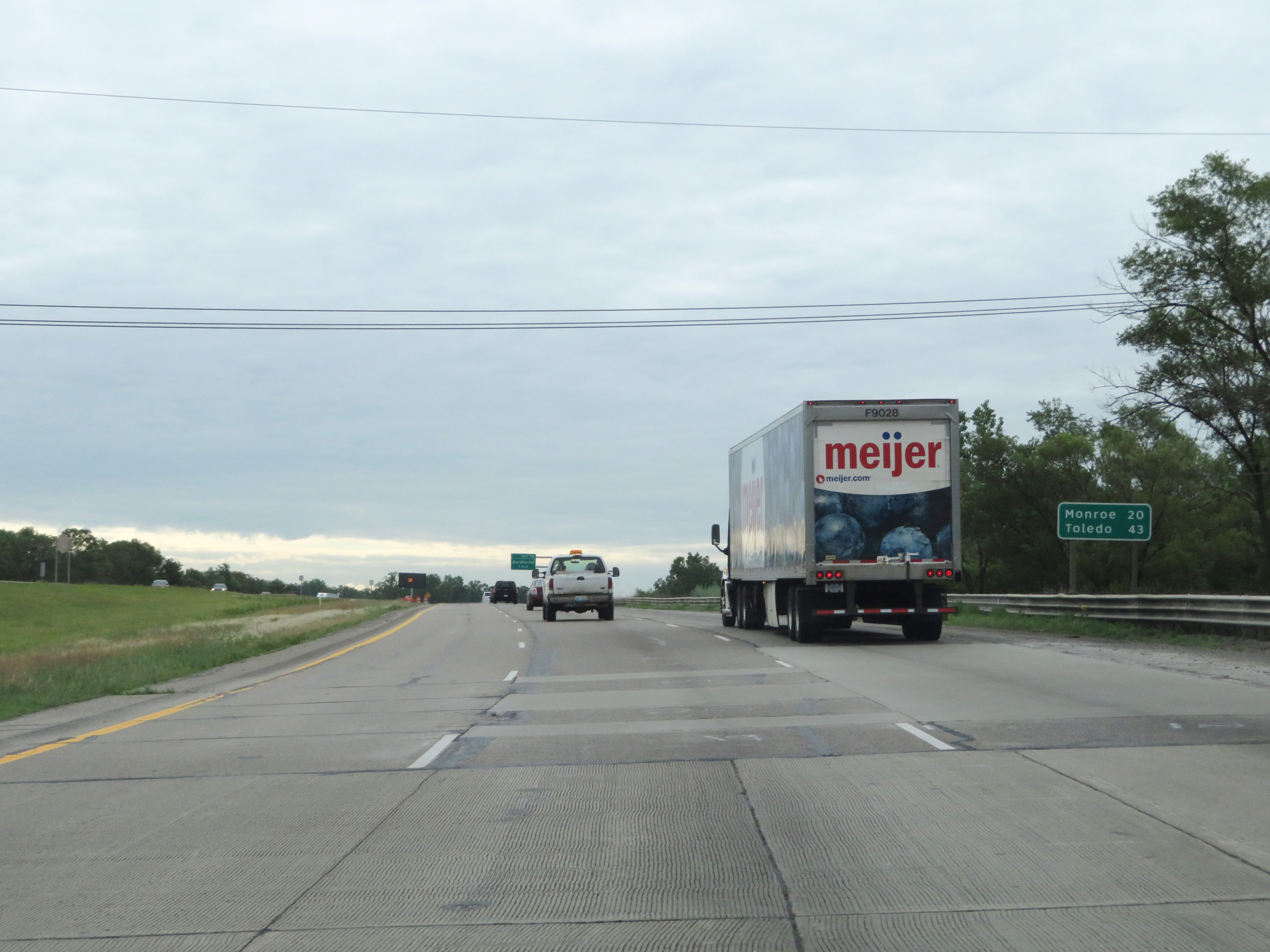 Mileage sign on Interstate 275 South. It's 20 miles to Monroe and 43 miles to Toledo. (Photo taken 7/15/17). |