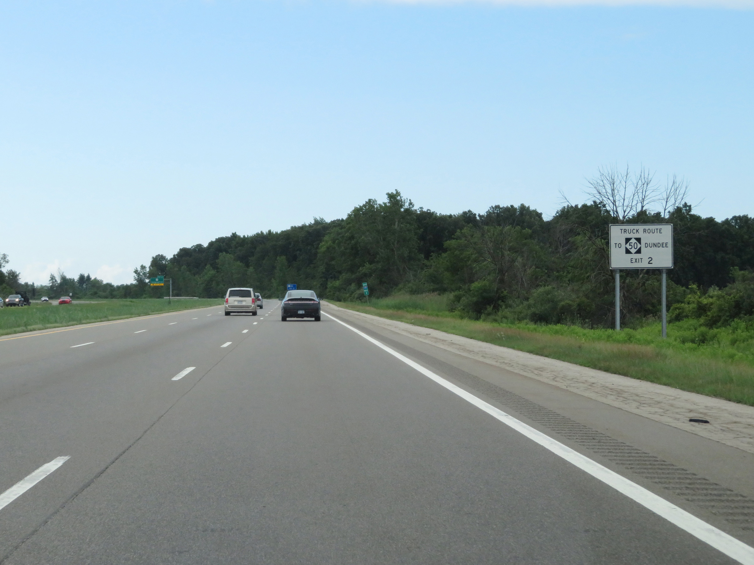 Take Exit 2 to the truck route to M-50 toward Dundee. (Photo taken 7/15/17). |