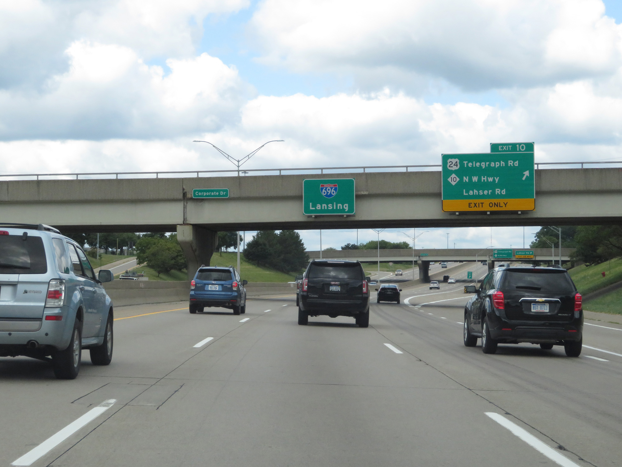 Interstate 696 West at Exit 10: US 24 / M-10 - Telegraph Rd / NW Hwy / Lahser Rd (Photo taken 7/15/17). |