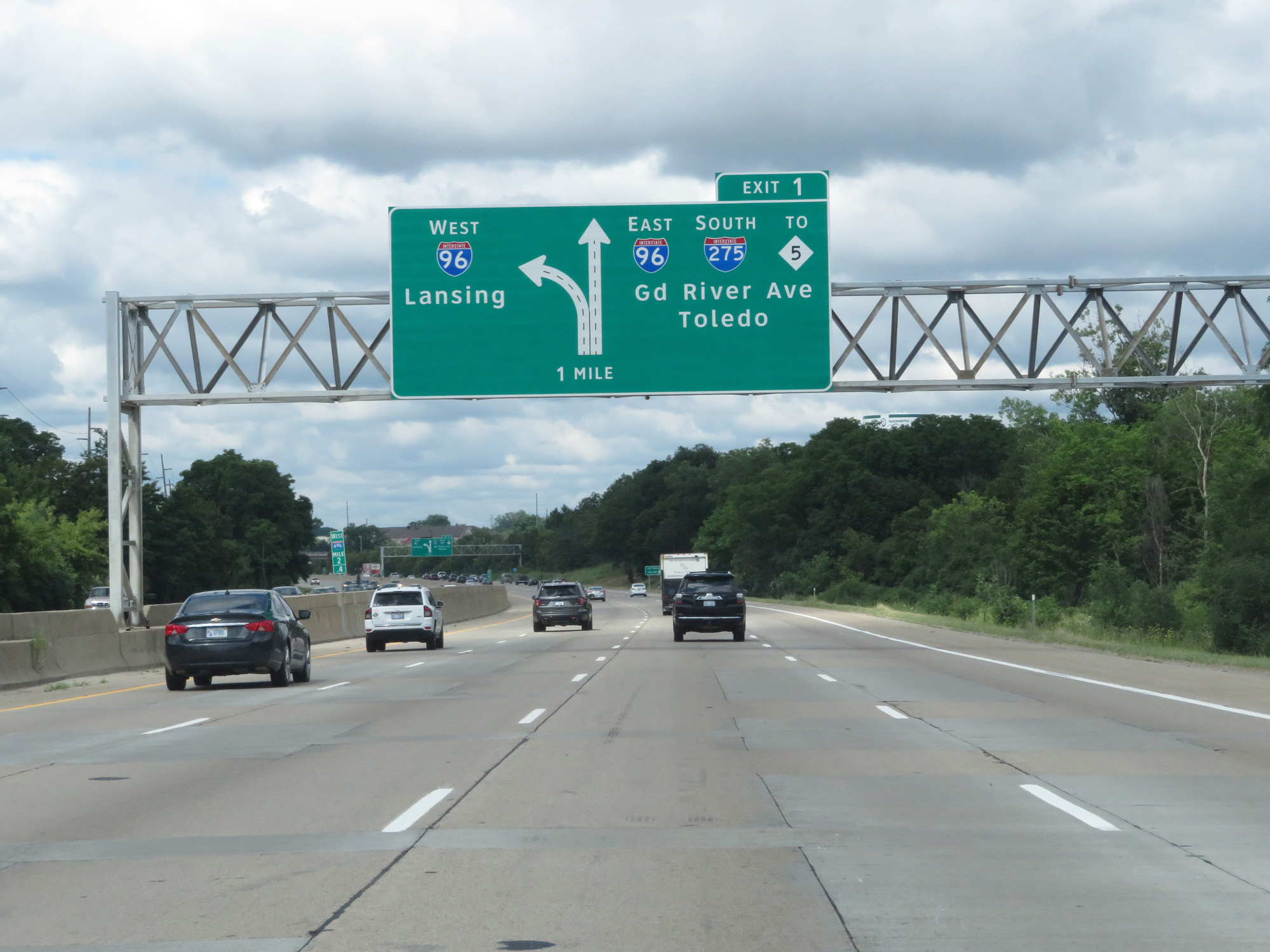 Interstate 696 West at Exit 1: Interstate 96 East / Interstate 275 South / To M-5 - Grand River Ave / Toledo (Photo taken 7/15/17). |