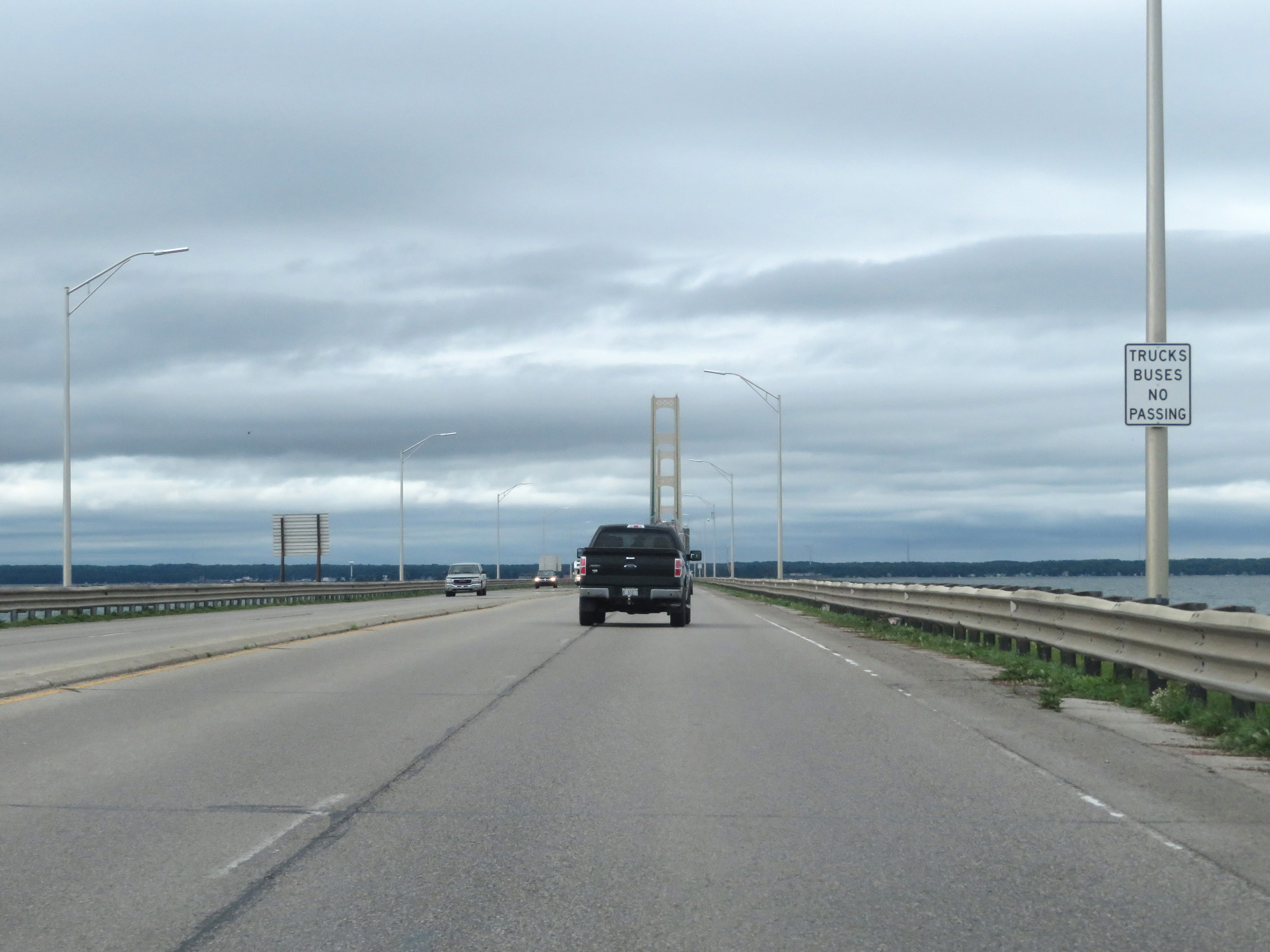 Trucks and buses are reminded that passing is prohibited until the southern end of the Mackinac Bridge. (Photo taken 7/16/17).  |